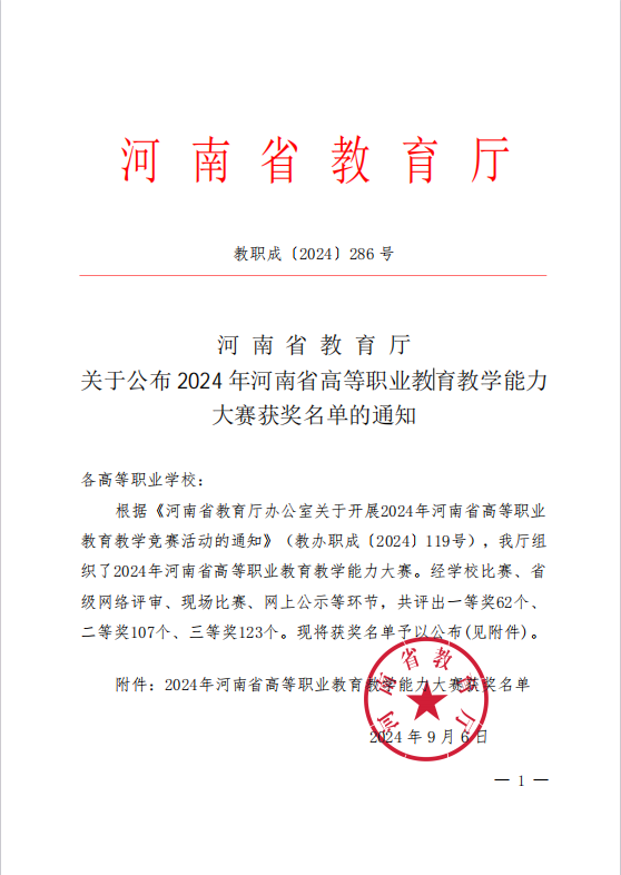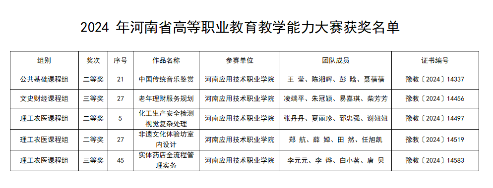 近日,河南省教育厅下发《关于公布 2024 年河南省高等职业教育教学能力大赛获奖名单的通知》(教办职成〔2024〕119号),我校选派的5支参赛队伍经学校校赛、省赛网评、现场决赛等环节,在全省292件参赛作品中脱颖而出,分别取得3个二等奖、2个三等奖。