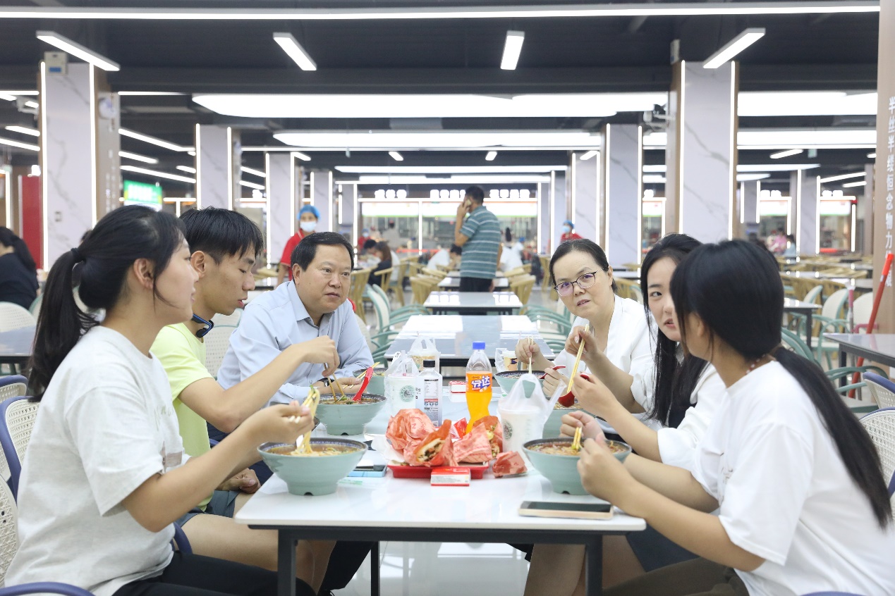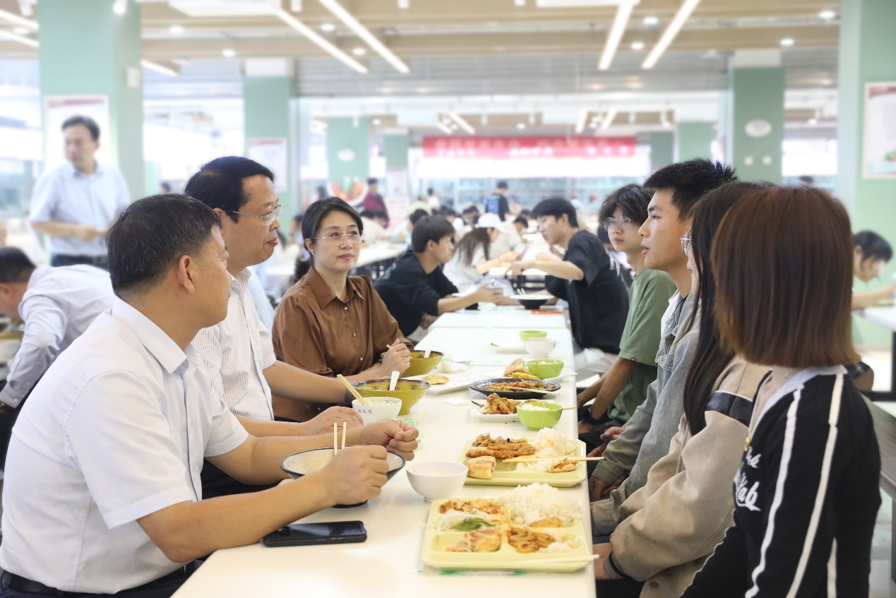 校领导分别深入到各学生餐厅,检查餐厅就餐环境、饭菜质量及价格、餐饮保障等情况,并听取餐厅工作人员汇报。用餐期间校领导与学生们围桌而坐,充分听取学生的意见建议,耐心解答学生们提出的各种问题,共话校园生活。话题广泛而深入,从食堂饭菜的口味到宿舍居住的感受,从大学角色的转变到社团活动的参与,同学们也积极回应,畅所欲言,将自己校园生活中的点点滴滴与领导们分享。