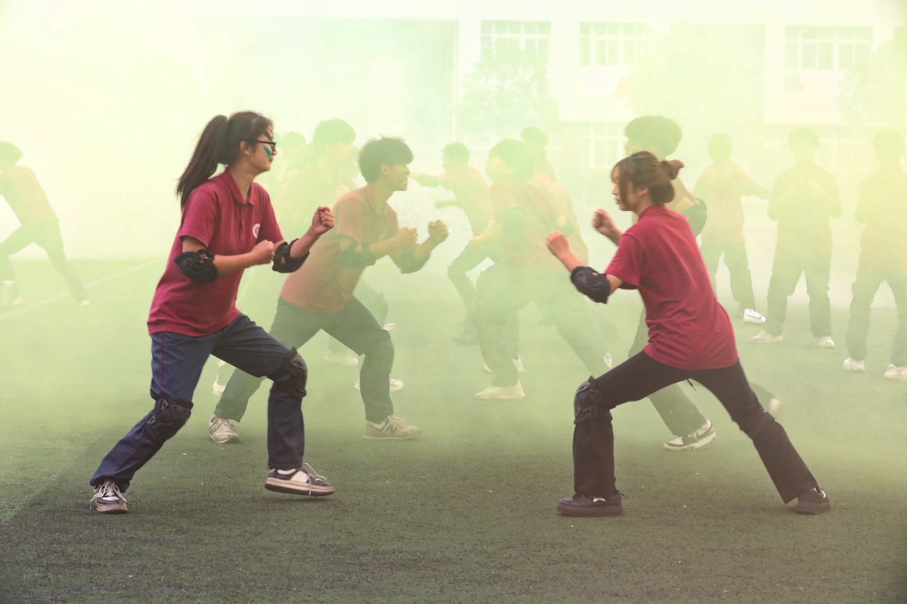 特色方队表演更是精彩纷呈:旗语表演动作利落、整齐划一;应急棍术表演气势如虹、刚劲有力;战术表演紧张刺激、扣人心弦;擒敌拳表演虎虎生威、震撼全场;数字方阵表演创意十足;格斗术表演动作凌厉,精彩绝伦;格斗匕首操表演既展示了同学们熟练的格斗招式,还通过场景还原展示了面对突发事件时灵活变换的阵型,一招一式尽展飒爽英姿。