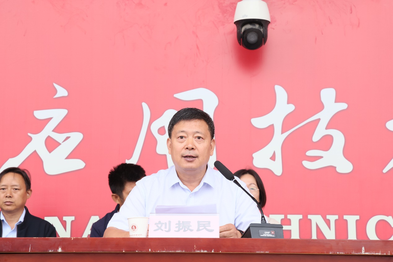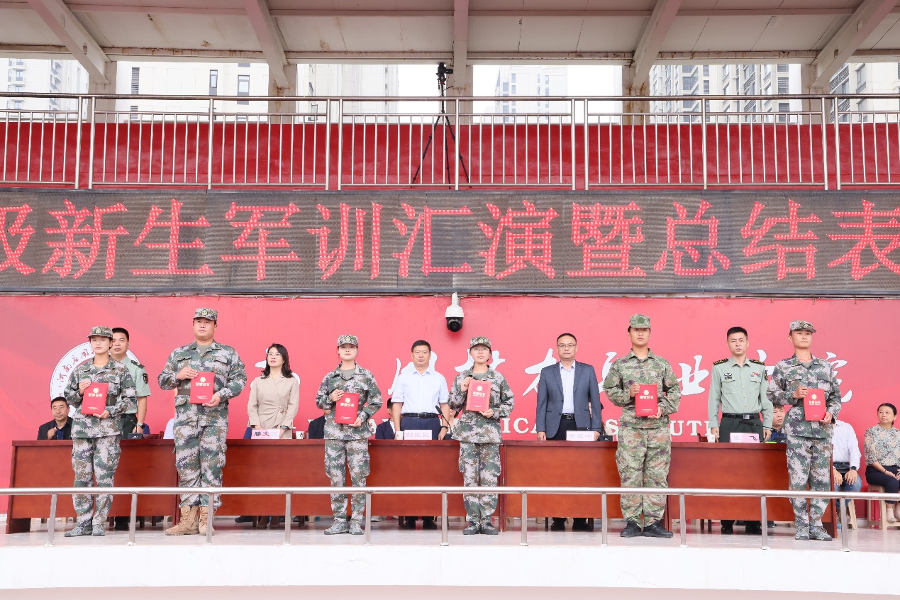 最后,副校长刘振民、常新中发表讲话。他们首先代表学校全体师生,向在军训工作中辛勤付出的工作人员致以崇高的敬意和诚挚的感谢,向圆满完成军训任务的参训同学们致以亲切的慰问,向在军训中涌现出来的先进集体和个人表示热烈的祝贺。他们在讲话中充分肯定了同学们严格服从命令、坚决听从指挥,勇于锤炼、敢于吃苦的优良作风。希望同学们在今后的学习和生活中,继续保持军训中培养的优良品质,努力学习、积极进取,不负时代重托、不负青春韶华。同时也对同学们提出三点要求:一是厚植家国情怀,书写青春华章。应心系国家事、肩扛国家责,与时代同行、与祖国同进,聚焦人类发展难题、对接国家战略需求,开阔大视野、涵养大情怀、练就大本领。二是奋楫学习之海,成就新时代有为青年。坚持把学习作为第一要务,养成自主、专注、多思、善问的好习惯,树牢“勤学笃行、求是创新”的躬耕态度,不断练就勇立潮头的过硬本领,为发展新质生产力、推动高质量发展注入青春力量。三是立足新时代,践行全面发展之路。要系统扎实地掌握专业知识,形成自己的专业思维,同时在学习之余,积极参加各种文体活动,注重身心健康,加强体育锻炼,树立正确的世界观、人生观和价值观,做有理想、有道德、有文化、有纪律的德智体美劳全面发展的社会主义建设者和接班人。