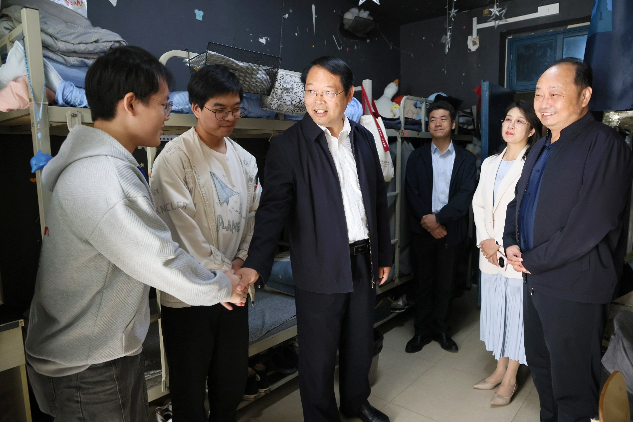 闫俊山一行到学生宿舍看望了留校学生,询问他们的假期计划、学习情况以及生活状况,提醒他们在宿舍要注意用电安全,保持良好生活习惯,树立健康阳光心态,以积极乐观的态度面对学习生活,营造和谐美丽校园环境。