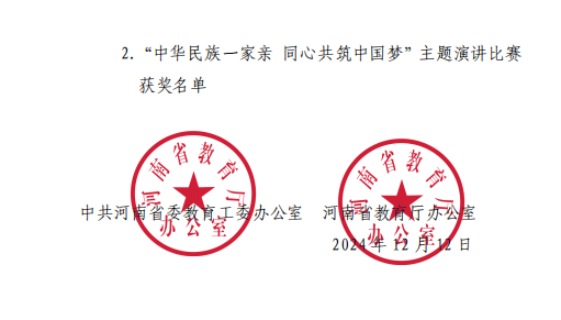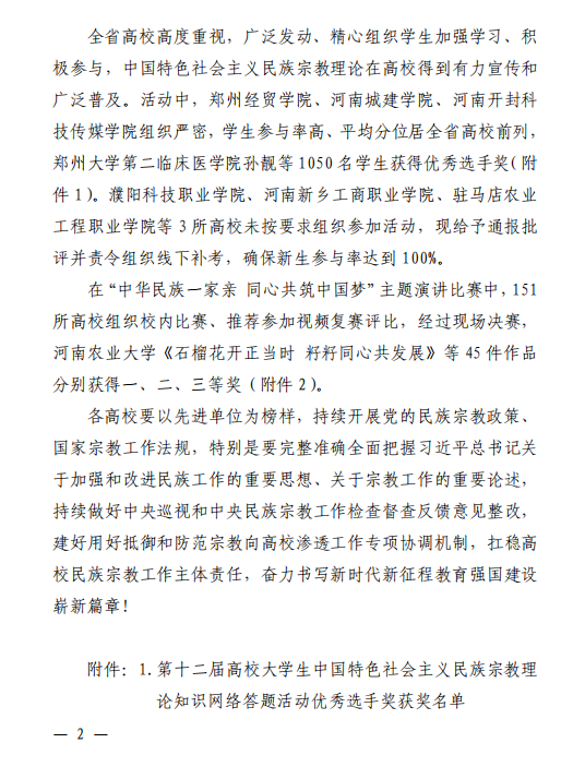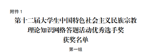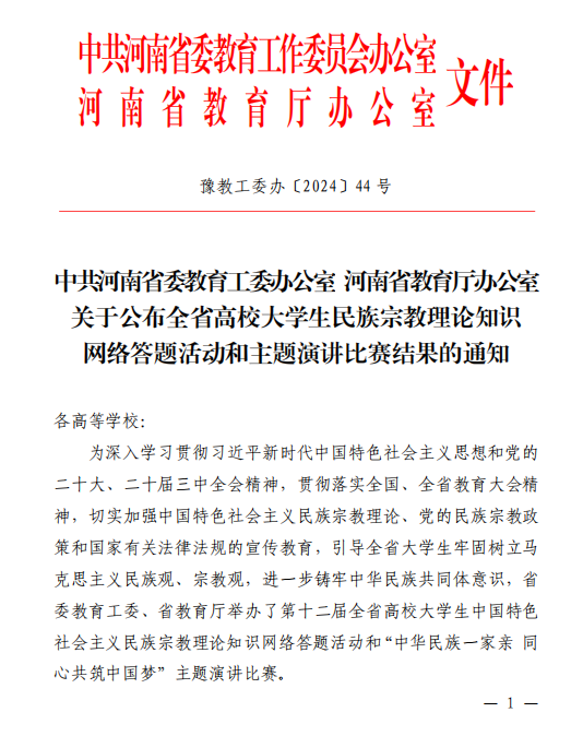近日,中共河南省委教育工委办公室、河南省教育厅办公室公布了河南省第十二届全省高校大学生中国特色社会主义民族宗教理论知识网络答题活动结果。我校王鑫等11位同学荣获“第十二届大学生中国特色社会主义民族宗教理论知识网络答题活动优秀选手奖”。