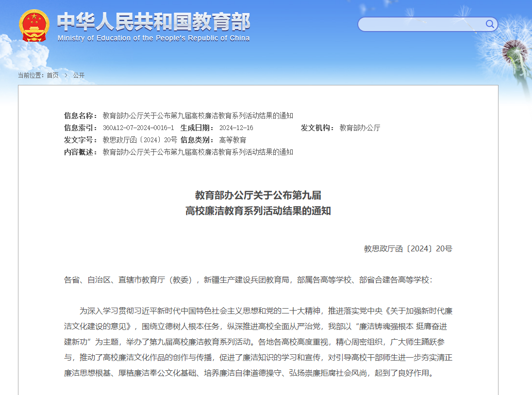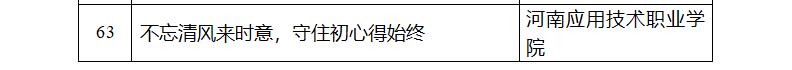 近日,我校推荐作品《不忘清风来时意,守住初心得始终》获评教育部《第九届高校廉洁教育系列活动》全国100件“一校一金句”网络微课遴选名单。该赛项中,我省共入选作品三项,我校是唯一一所高职院校。这是继去年学校获评河南省首批清廉学校创建行动示范校培树单位后,又取得的一项代表性成果。据悉,“一校一金句”赛项获评作品,将有望在央视网、中国大学生在线、中国教育发布等平台进行展播。