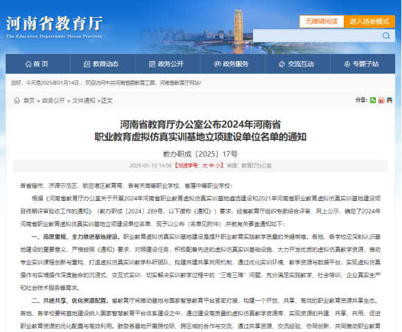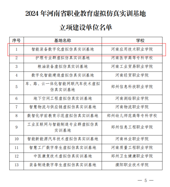 近日,河南省教育厅发布《关于公布2024年河南省职业教育虚拟仿真实训基地立项建设单位名单的通知》(教办职成〔2025〕17号),我校智能装备数字化虚拟仿真实训基地获批省级立项。