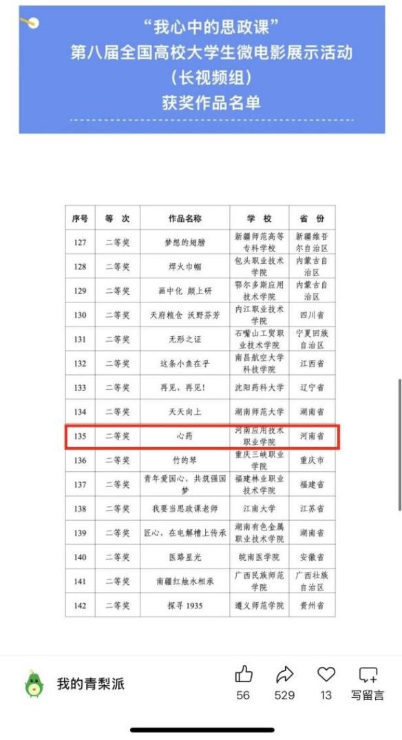 微电影获奖作品《心药》从1006所高校提交的3134部作品中突破重围,是学校“大思政课”建设与青年成长深度融合的生动展示。作品以“小切口”诠释“大主题”,透过大学生麦冬的成长棱镜,折射出当代青年对人生价值的哲学思考。主创团队以青春影像呼吁青年学生以高尚的人生追求指引人生的奋斗目标,以最淳朴的感情为世界留下光与热。