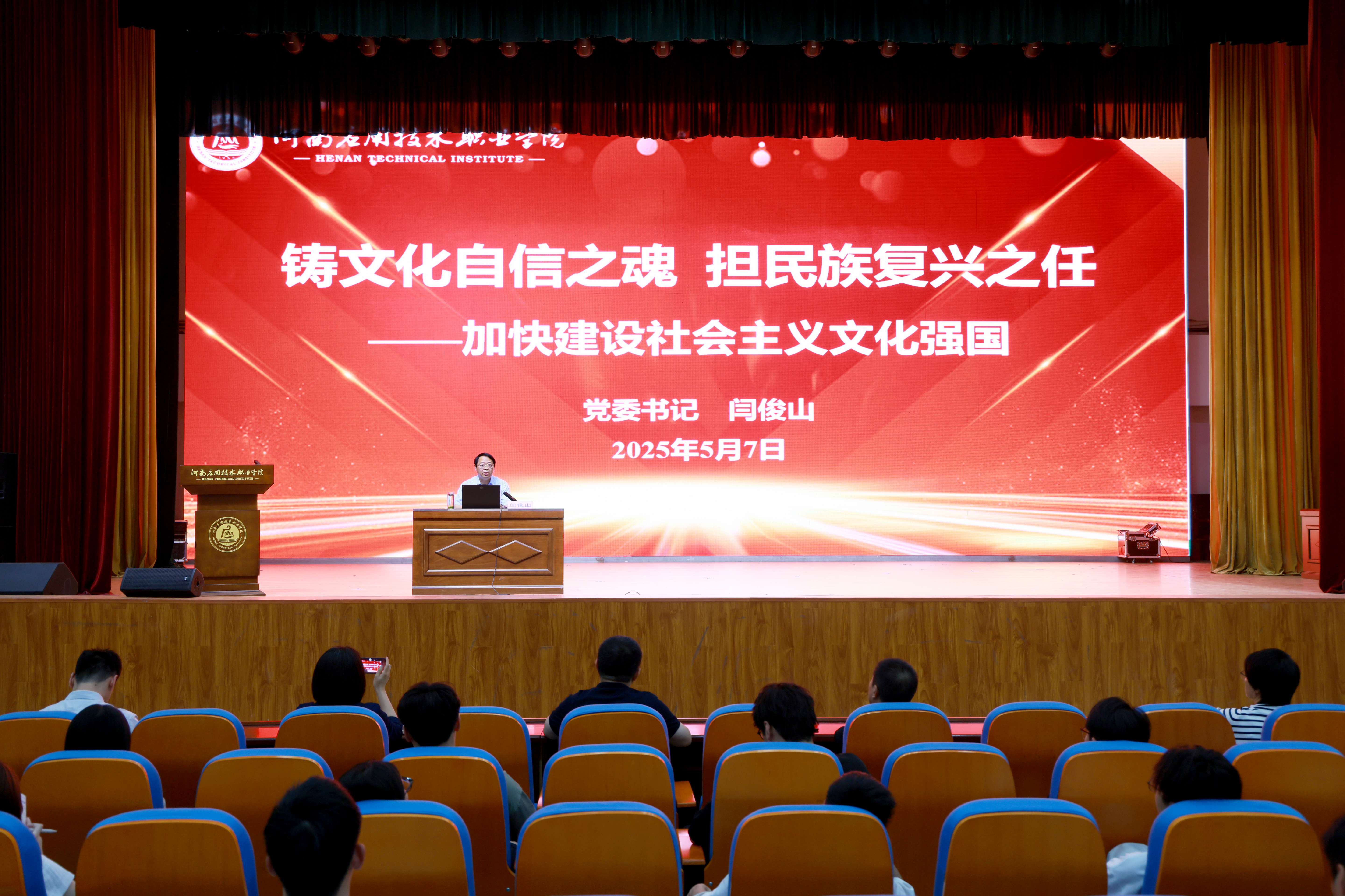 为深入学习领会习近平文化思想精神实质和丰富内涵,引导青年学生坚定文化自信,积极投身社会主义文化强国建设,5月7日,党委书记闫俊山以“铸文化自信之魂担民族复兴之任”为主题,为本科部学生讲授了一堂精彩的思政大课。