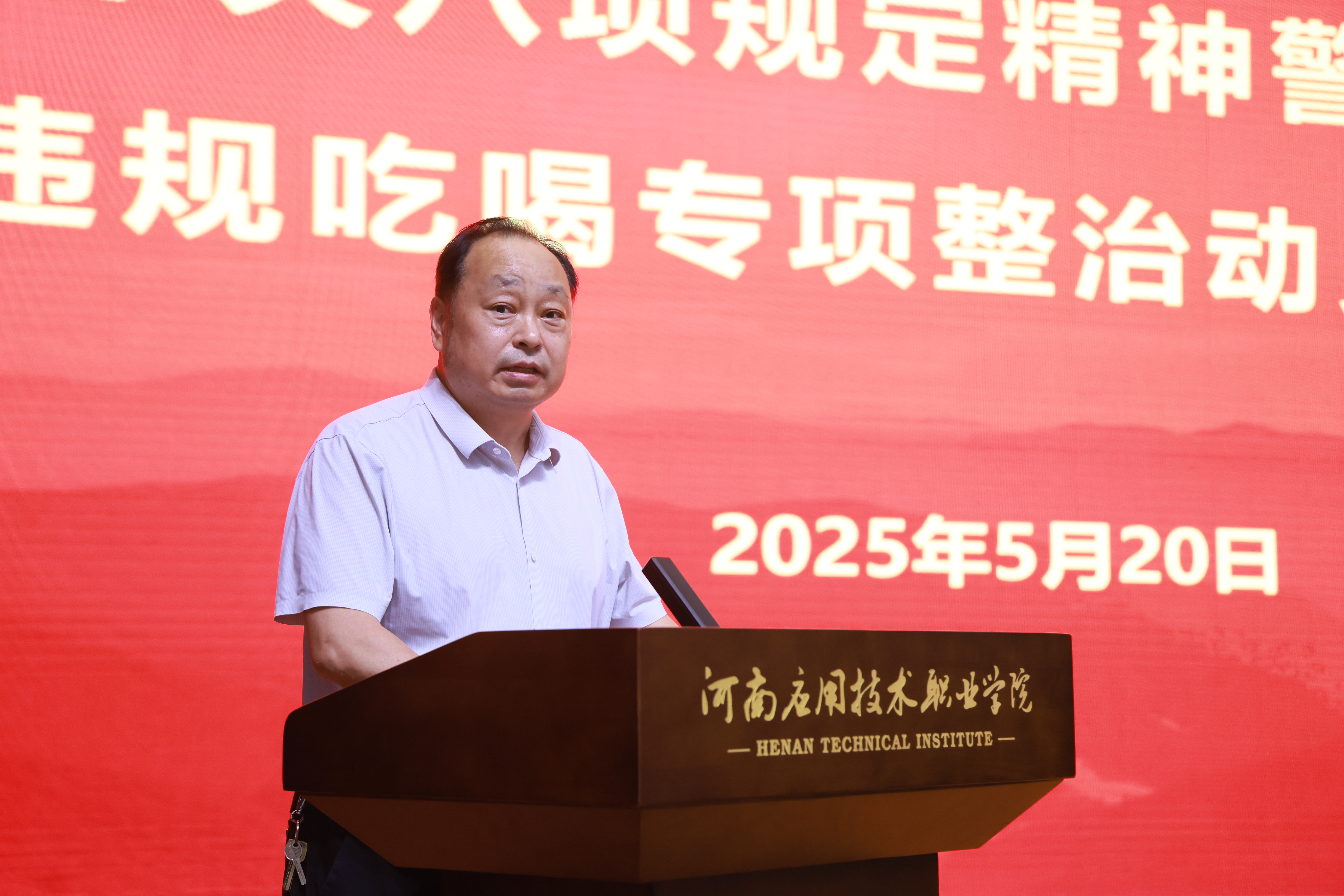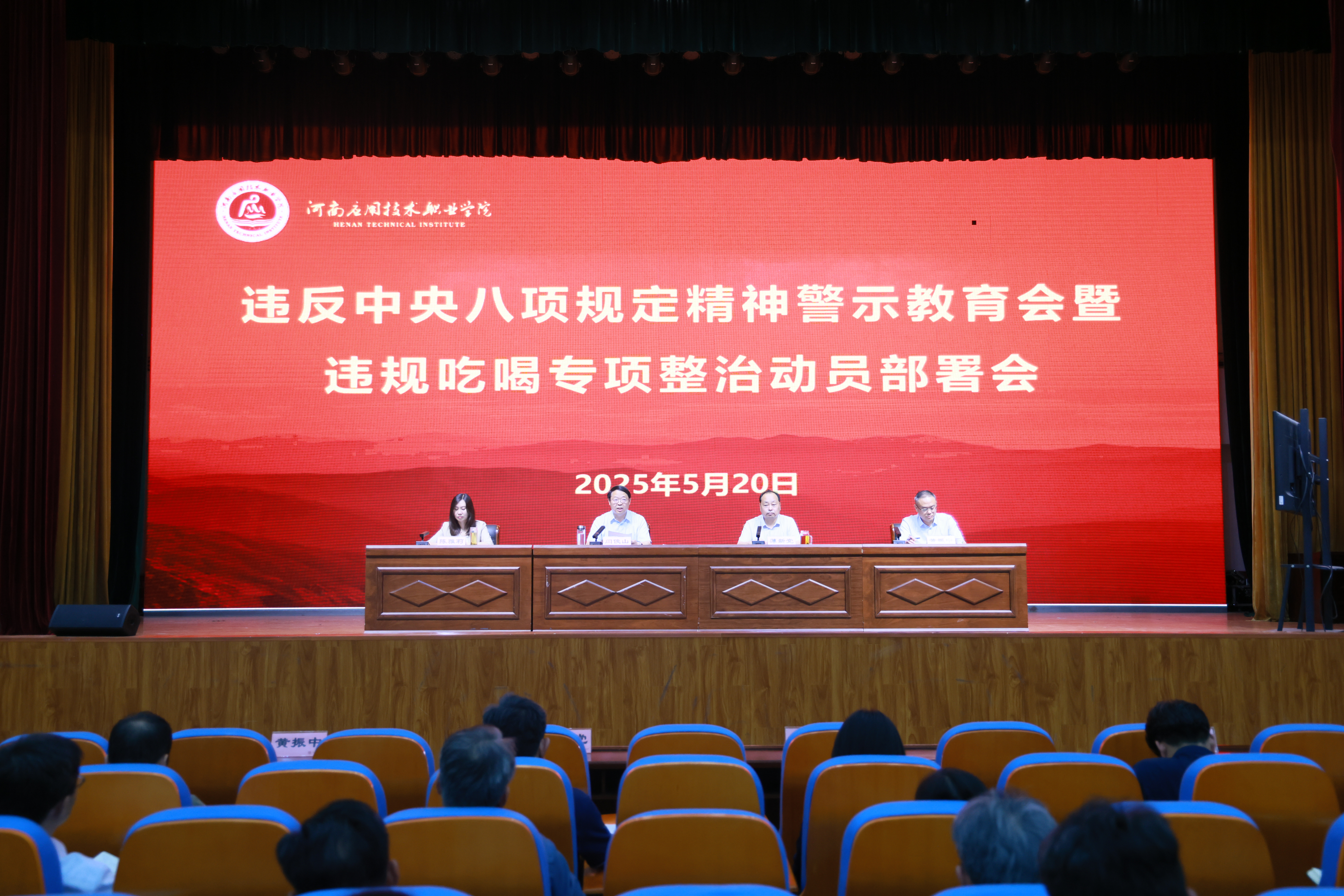 5月20日下午,我校召开违反中央八项规定精神警示教育会暨违规吃喝专项整治动员部署会议。学校全体党委委员、纪委委员,全体副科级以上干部和各党总支(直属党支部)纪检委员参加会议。校长薄新党主持会议。