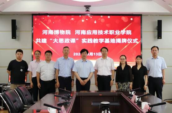 为深入推进“大思政课”建设,搭建“行走的思政课堂”,6月13日,我校与河南博物院“大思政课”实践教学基地揭牌仪式在河南博物院举行。我校党委书记闫俊山,党委副书记、工会主席陈君丽;河南博物院党委书记王九位、副院长信木祥、人事处处长兰恩强出席仪式。学校党委办公室、党委宣传(统战)部、马克思主义学院负责人和部分师生代表参加仪式。仪式由信木祥主持。