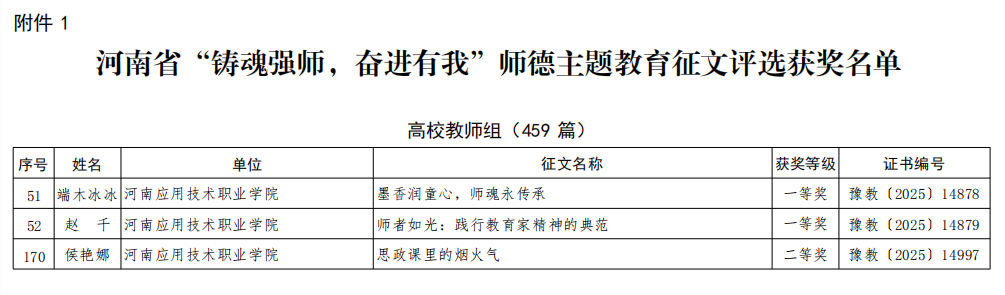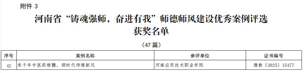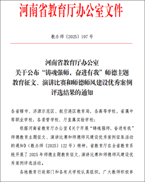 近日,河南省教育厅办公室发布《关于公布“铸魂强师,奋进有我”师德主题教育征文、演讲比赛和师德师风建设优秀案例评选结果的通知》(教办师〔2025〕197号),我校喜获省级师德主题教育征文一等奖2项、二等奖1项、师德师风建设优秀案例1项。