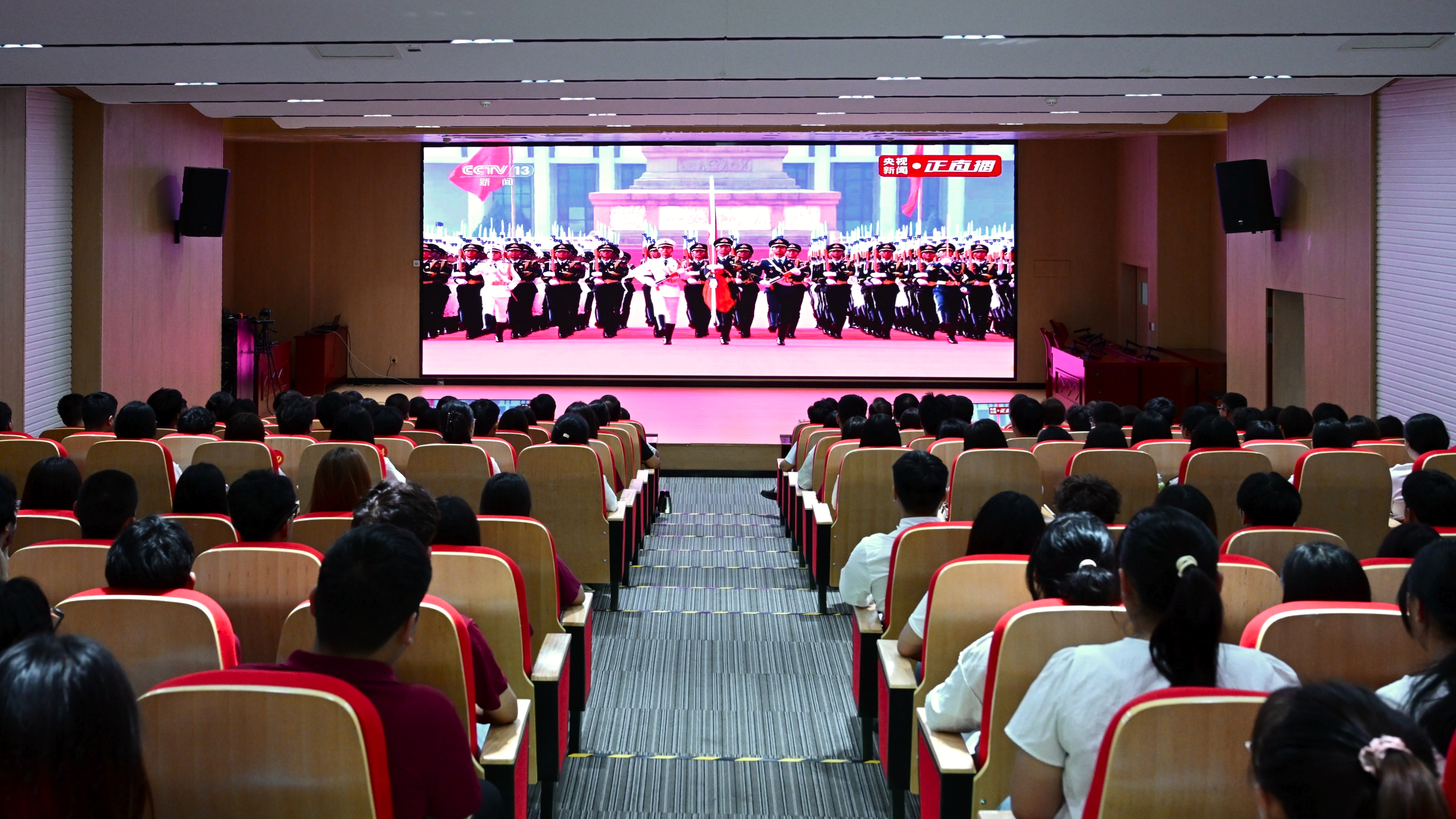 当激昂的国歌声响起,全体师生起立,齐声高唱国歌,眼底满是肃穆与坚定。习近平总书记发表的重要讲话,鲜明传递出铭记历史、缅怀先烈、珍爱和平、开创未来的坚定决心。分列式中,参阅部队的挺拔英姿,军事航天部队、网络空间部队、信息支援部队、联勤保障部队的首次集中展示,新型装备和明星装备的集中亮相,充分展现了抗战英雄部队的血脉传承和新时代人民军队政治建军新风貌。观看过程中,会场每个人都神情专注,脸上洋溢着笑容,不时响起阵阵掌声和欢呼声。阅兵现场的盛大场面,让广大师生切实感受到祖国日益强盛的国防实力,自豪之感油然而生。我校全体师生将深入学习贯彻习近平总书记重要讲话精神,传承和弘扬伟大抗战精神,踔厉奋发、勇毅前行,为以中国式现代化全面推进强国建设、民族复兴伟业而团结奋斗!