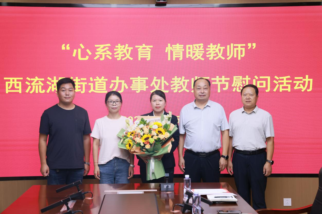 李淼代表郑州市中原区西流湖街道办事处向我校辛勤耕耘在教育一线的全体教师,致以节日的诚挚问候和崇高敬意,为我校教师代表赵丹丹送上精美的慰问花束和节日祝福。