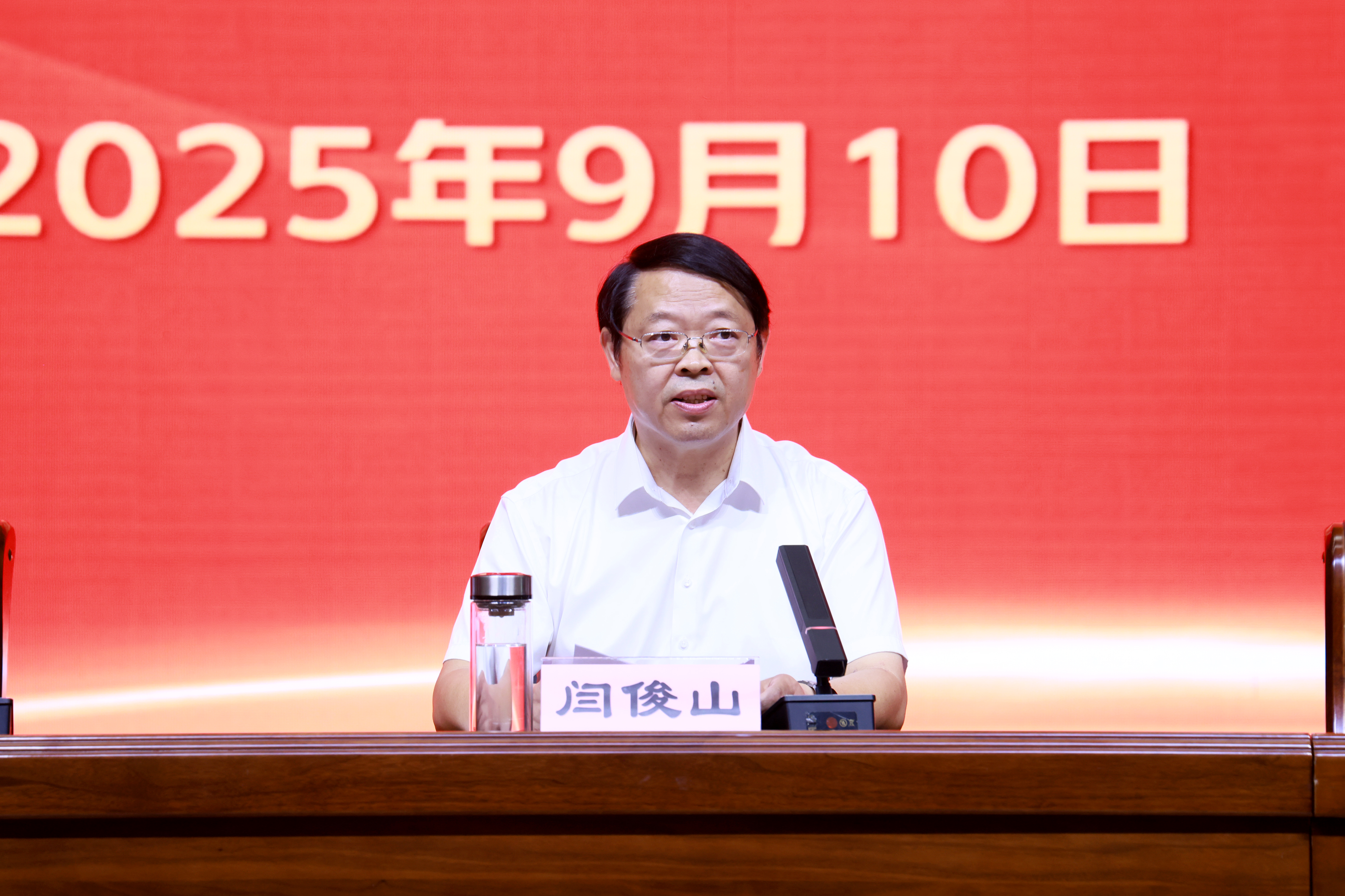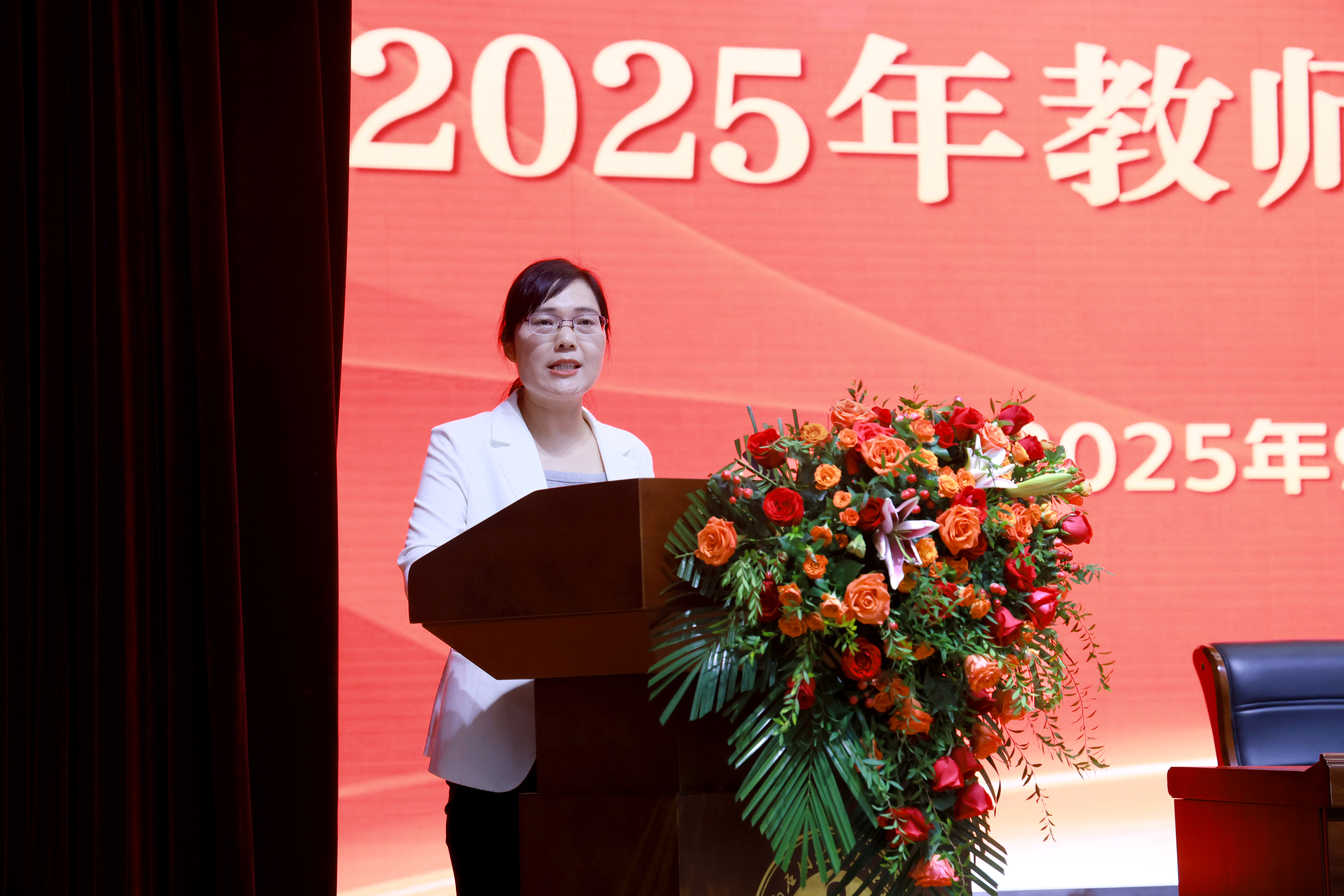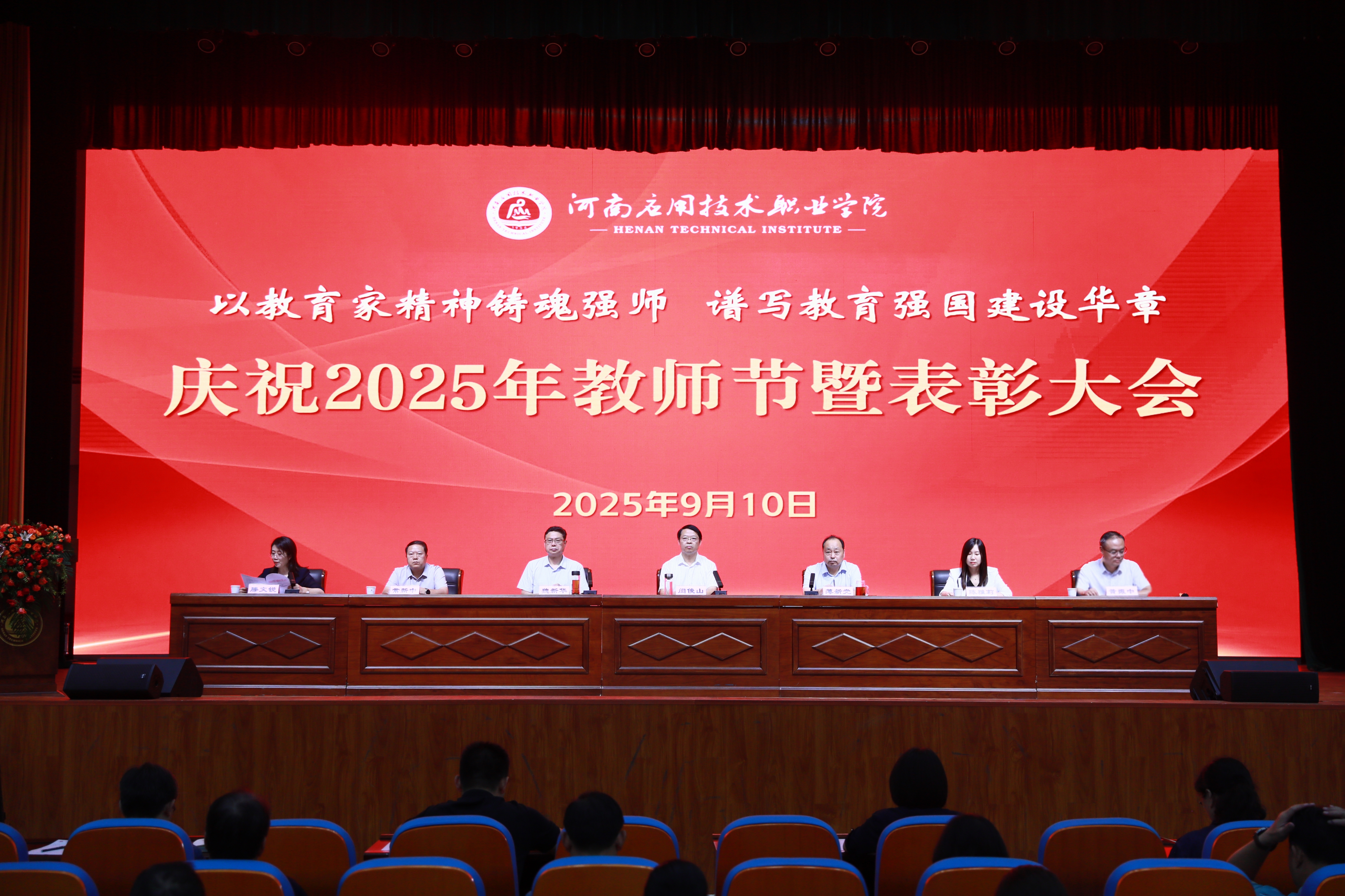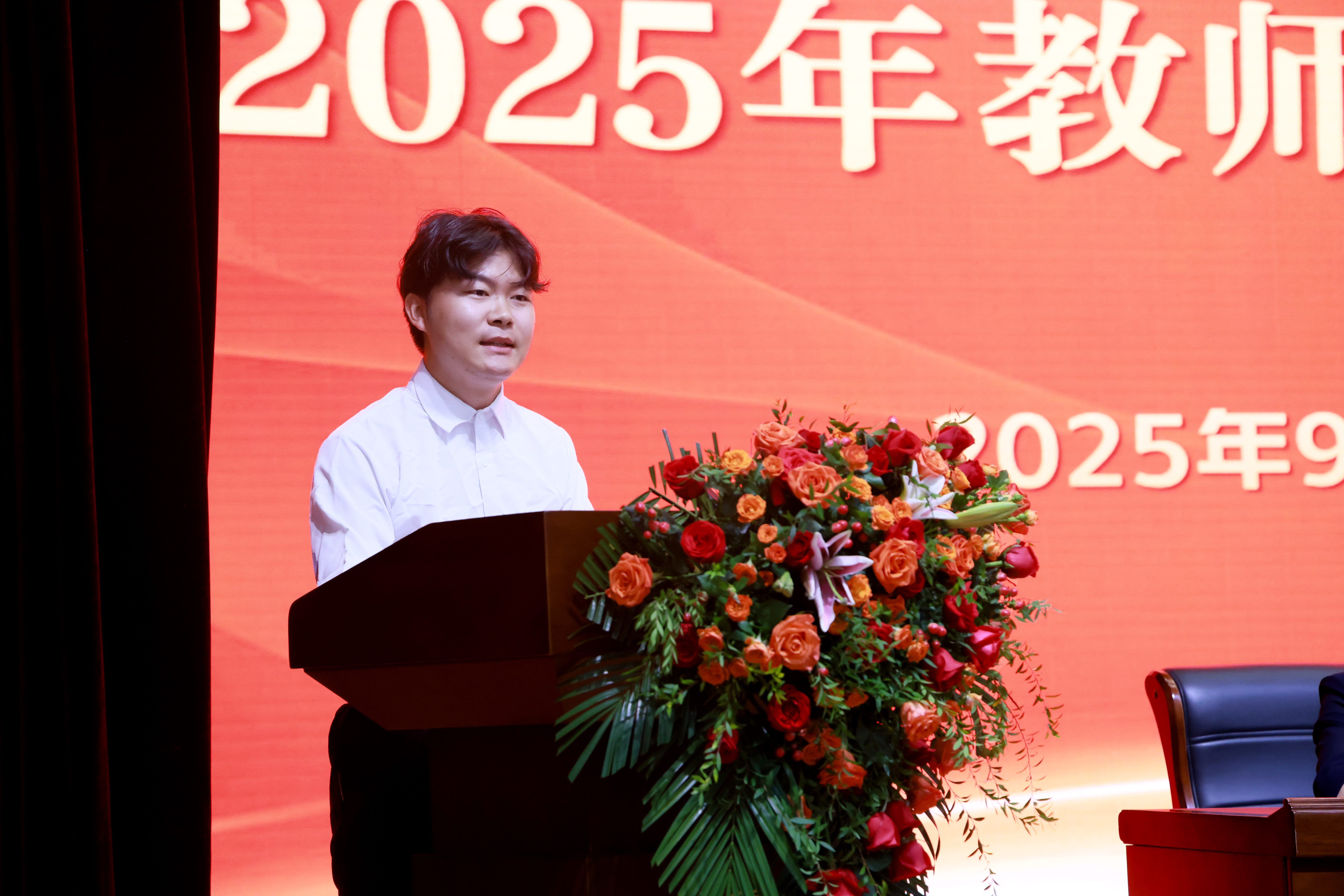 党委书记闫俊山发表讲话。他表示,一年来,学校广大教职员工坚持以习近平新时代中国特色社会主义思想为指导,全面贯彻党的教育方针,紧紧围绕立德树人根本任务,聚焦内涵提升与特色发展,各项事业取得了令人鼓舞的新成效。为弘扬教育家精神,引领广大教师在教育强国和教育强省建设的伟大征程中坚守初心与使命,闫俊山提出五点意见:一是铸牢为师之魂,做立德树人的“引路人”。要把理想信念和道德品质培养摆在教育的突出位置,构建全员、全过程、全方位育人新格局,全面落实立德树人根本任务,努力培养更多让党放心、爱国奉献、担当民族复兴重任的时代新人。二是锤炼立业之能,做德技并修的“大先生”。要坚持德技并修,以高尚师德引领成长,以精深学识启迪智慧,以扎实实践服务社会,培养更多高素质技术技能人才、能工巧匠、大国工匠。三是勇挑应担之责,做攻坚克难的“奋斗者”。要以“知责敢为、善作善成”的奋斗姿态,强化责任意识,昂扬攻坚锐气,提升落实本领,真正把规划图转化为实景图,共同推动学校事业发展。四是涵养仁爱之心,做启迪心灵的“筑梦人”。要遵循教育教学规律和学生身心发展规律,有教无类、因材施教,雪中送炭、润物无声,真正做到一切为了学生,为了学生一切,努力成为学生的良师益友。五是凝聚奋进之志,做事业发展的“共建者”。要始终同心同向、携手共进,以齐心推动事业兴旺,以暖心促进发展顺畅,以聚心铸就学校强大,共同谱写高质量发展新篇章。