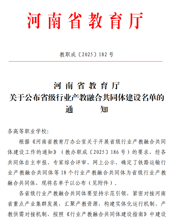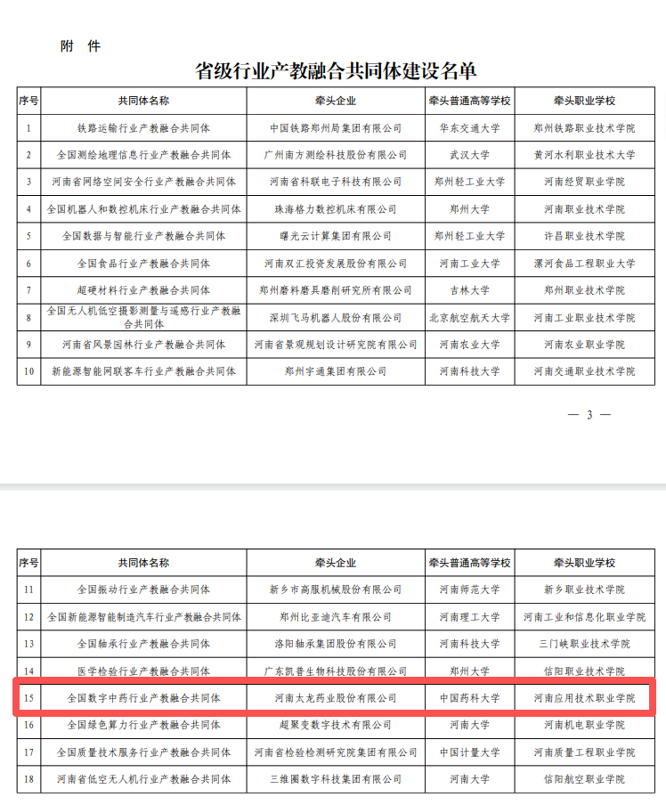 近日,河南省教育厅正式印发《关于公布省级行业产教融合共同体建设名单的通知》(教职成〔2025〕182号)。由河南太龙药业股份有限公司、中国药科大学与我校共同牵头成立的“全国数字中药行业产教融合共同体”成功入选。