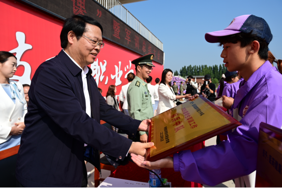 会操结束后,学校对军训中表现优异的集体与个人予以表彰。黄振中、滕文锐宣读表彰决定,校领导为“标兵中队”“标兵宿舍”“军训标兵”及“优秀教官”代表颁发了荣誉证书。闫俊山、薄新党分别代表学校向承训单位——中原区人民武装部、开封市龙亭区人民武装部赠送锦旗,表达对全体教官辛勤付出的诚挚谢意。