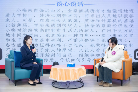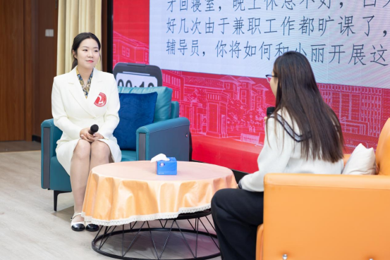 谈心谈话环节高度还原工作现场,选手与助演学生就具体问题深度交流,以共情建立信任,以说理澄清是非,将思想价值引领巧妙融入问题解决过程,彰显了扎实的专业功底与深厚的育人情怀。
