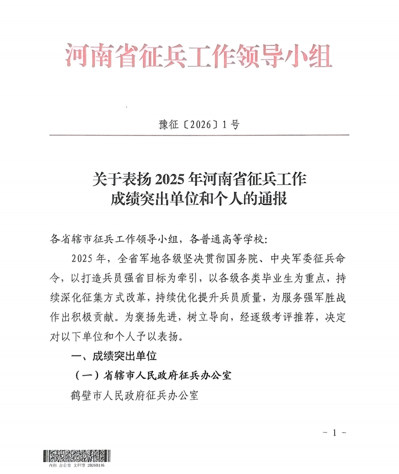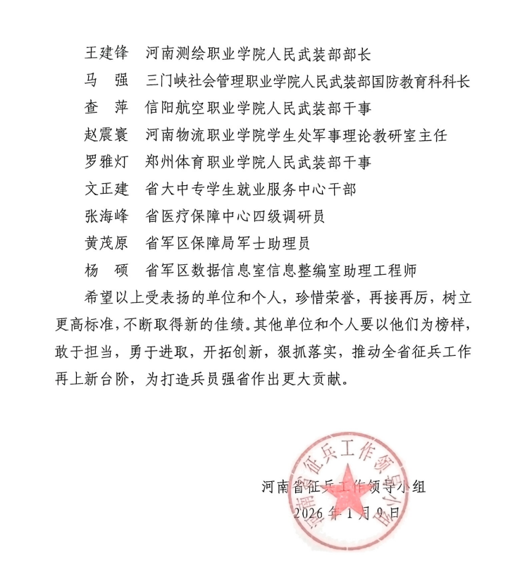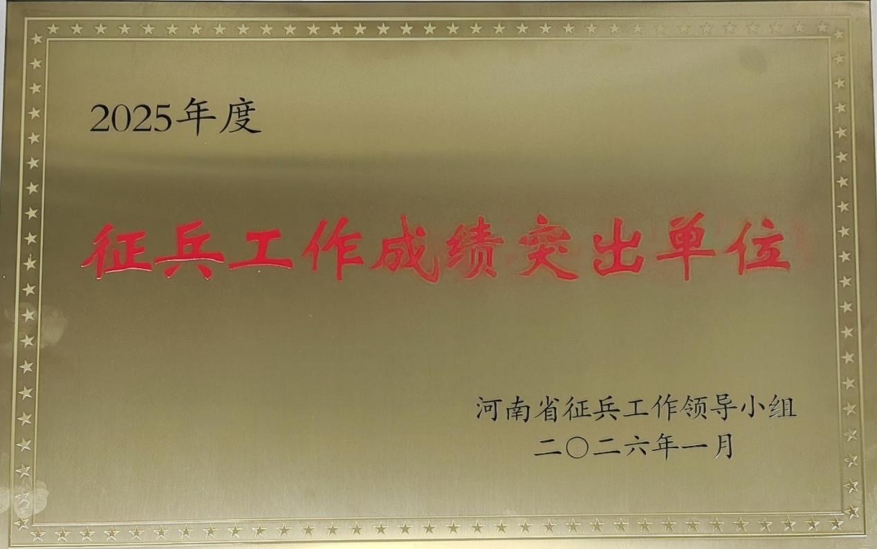 近日,河南省征兵工作领导小组发布《关于表扬2025年河南征兵工作成绩突出单位和个人的通报》(豫征〔2026〕1号),我校凭借在征兵工作中的扎实举措与显著成效,被授予“2025年度征兵工作成绩突出单位”荣誉称号。