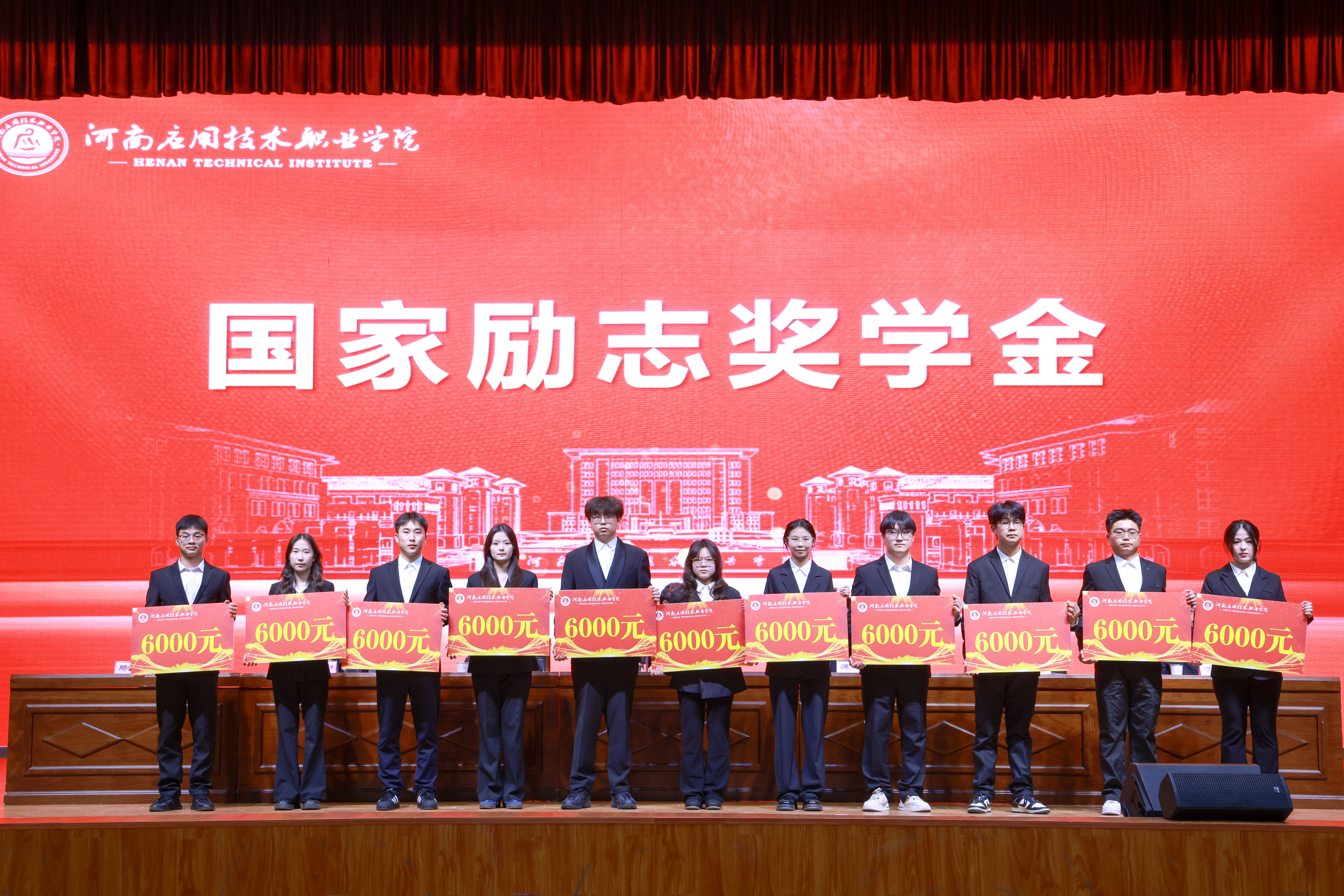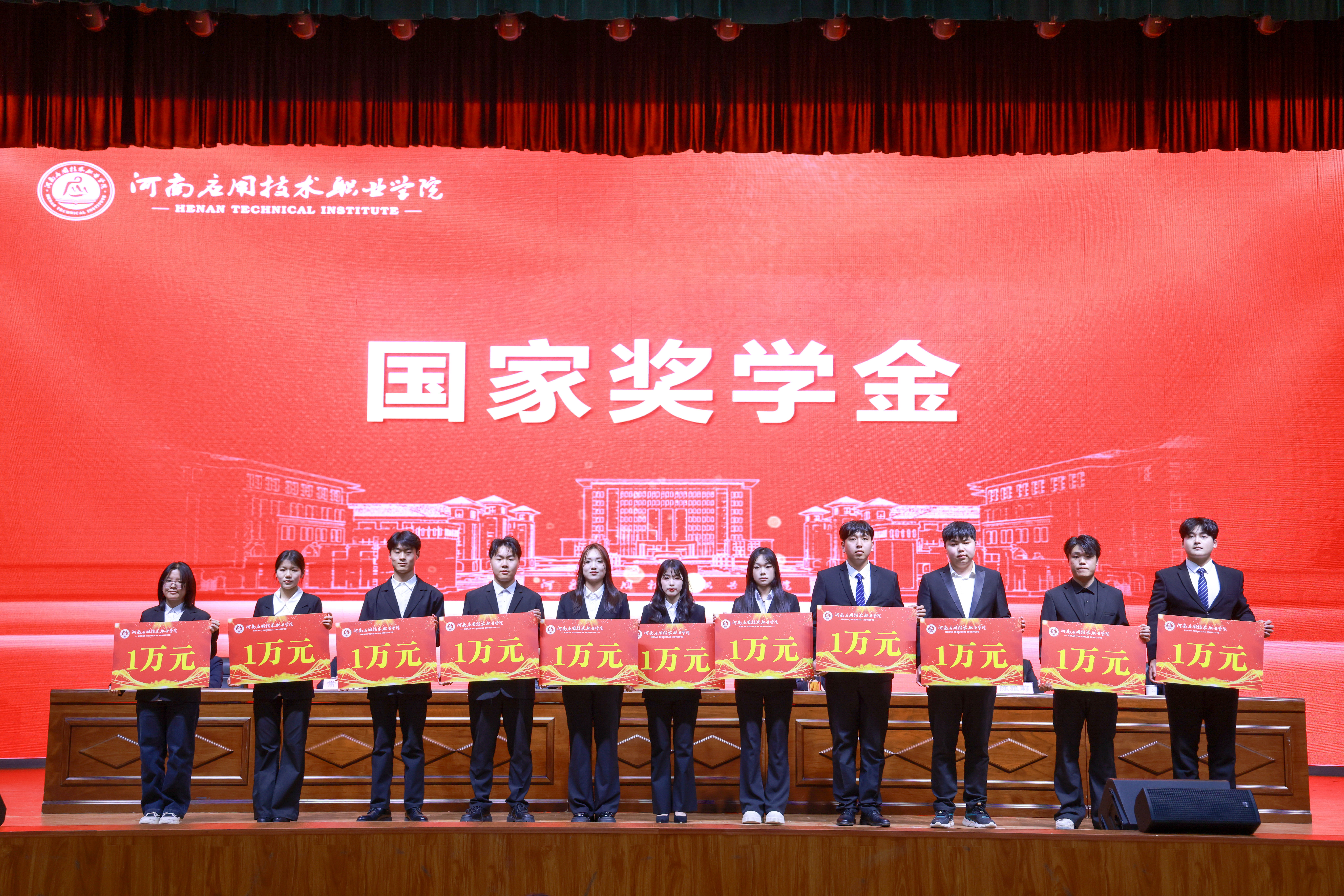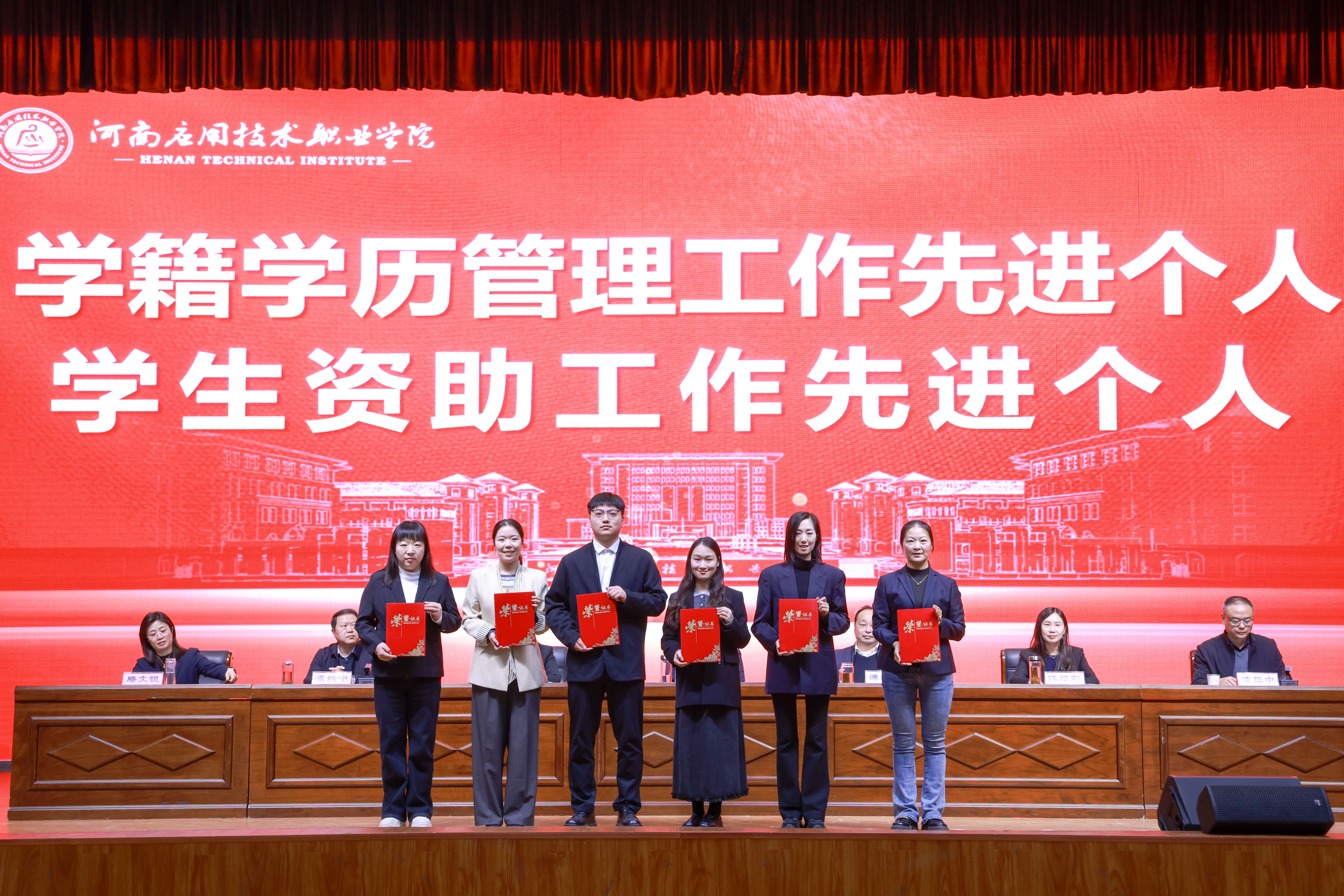党委副书记、工会主席陈君丽宣读《河南应用技术职业学院关于表彰2025年国家奖学金、国家励志奖学金获得者的决定》等6个表彰文件。与会校领导为获奖集体与个人颁奖。