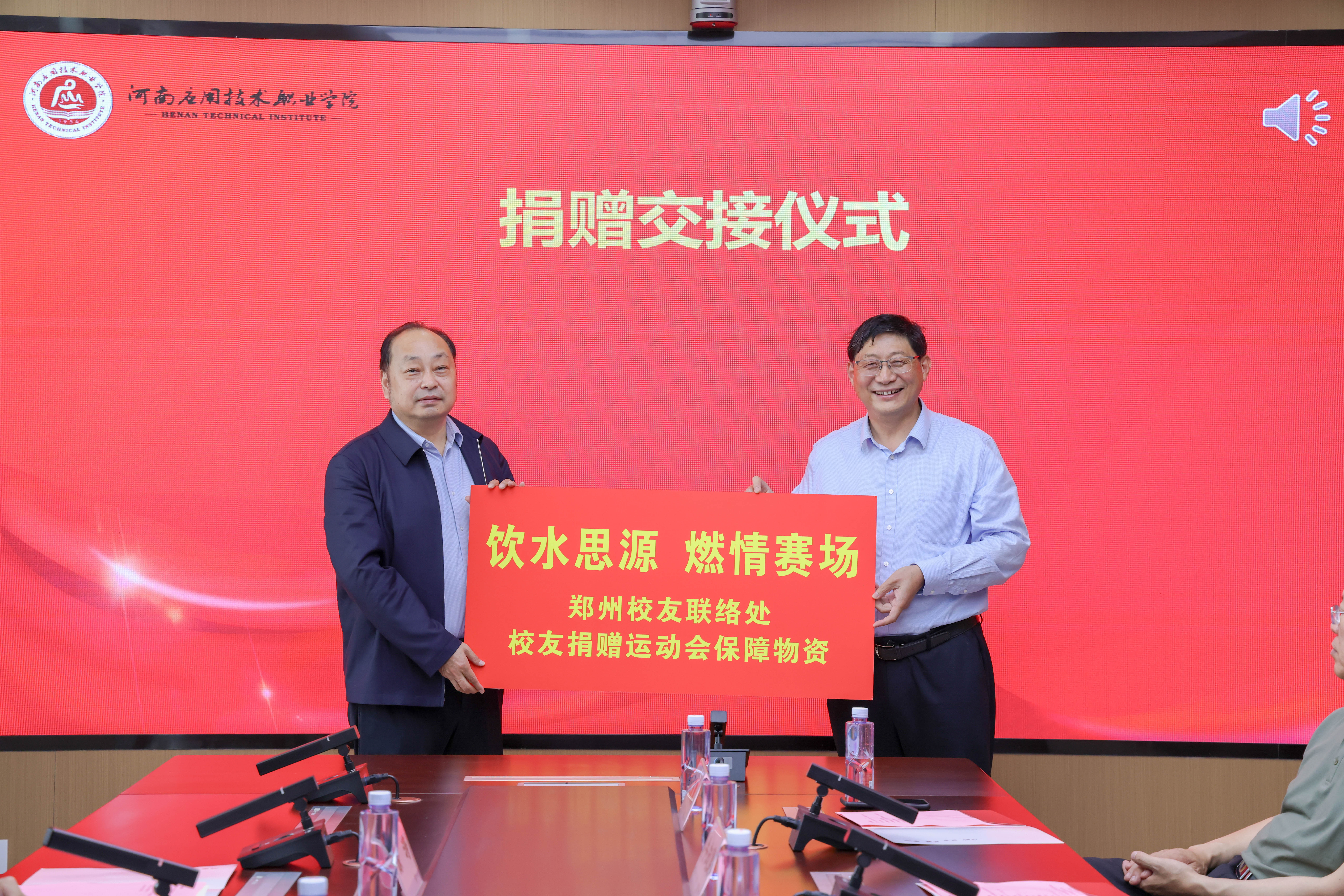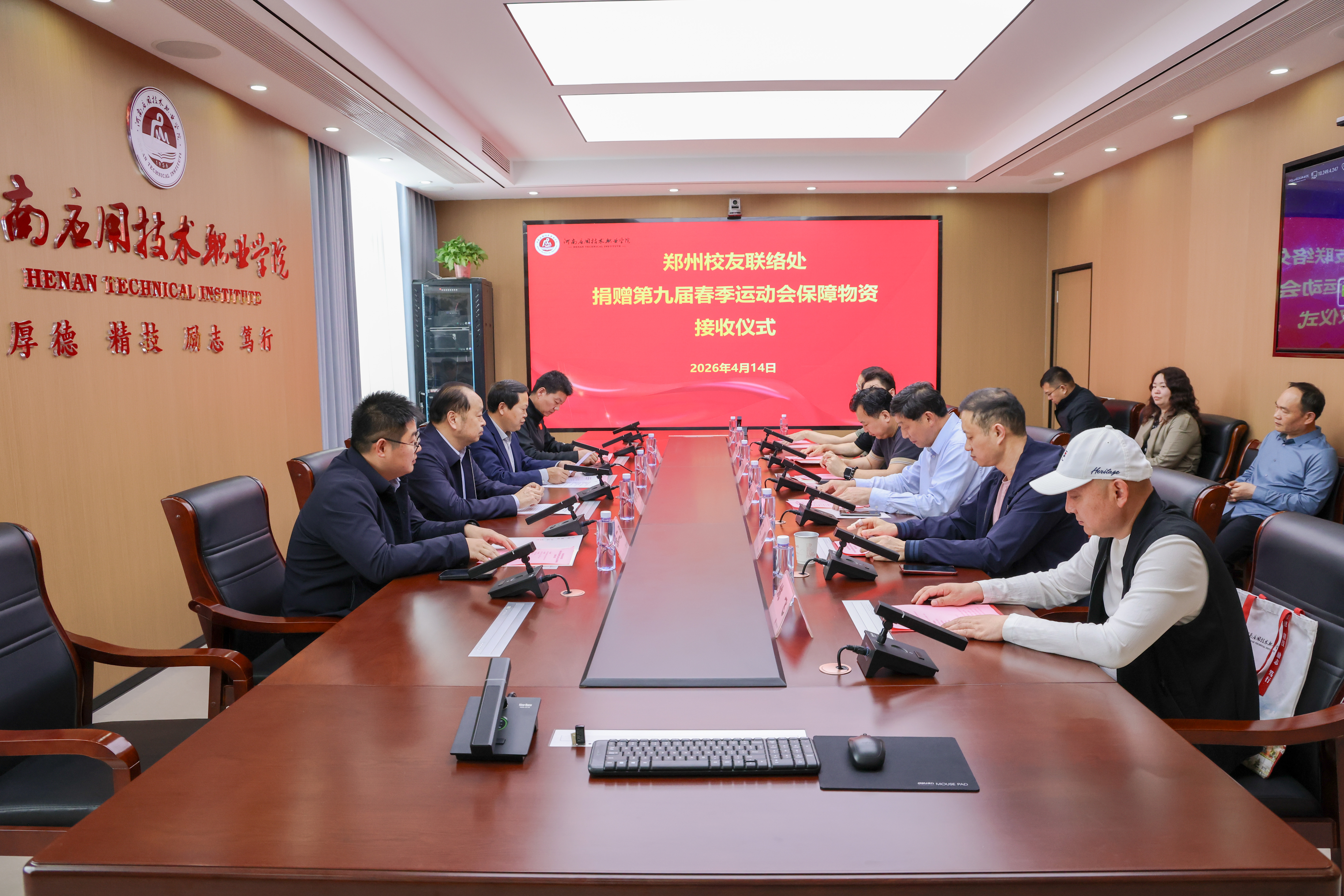 4月14日下午,学校郑州校友联络处捐赠春季运动会保障物资接收仪式在郑州校区办公楼315会议室举行。校长薄新党、副校长常新中出席仪式,郑州校友联络处校友代表宋耀辉及其他校友代表,招生就业与校企合作处负责人、体育教学部负责人参加仪式。仪式由常新中主持。