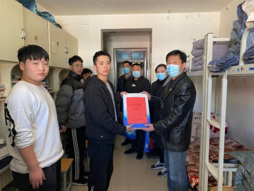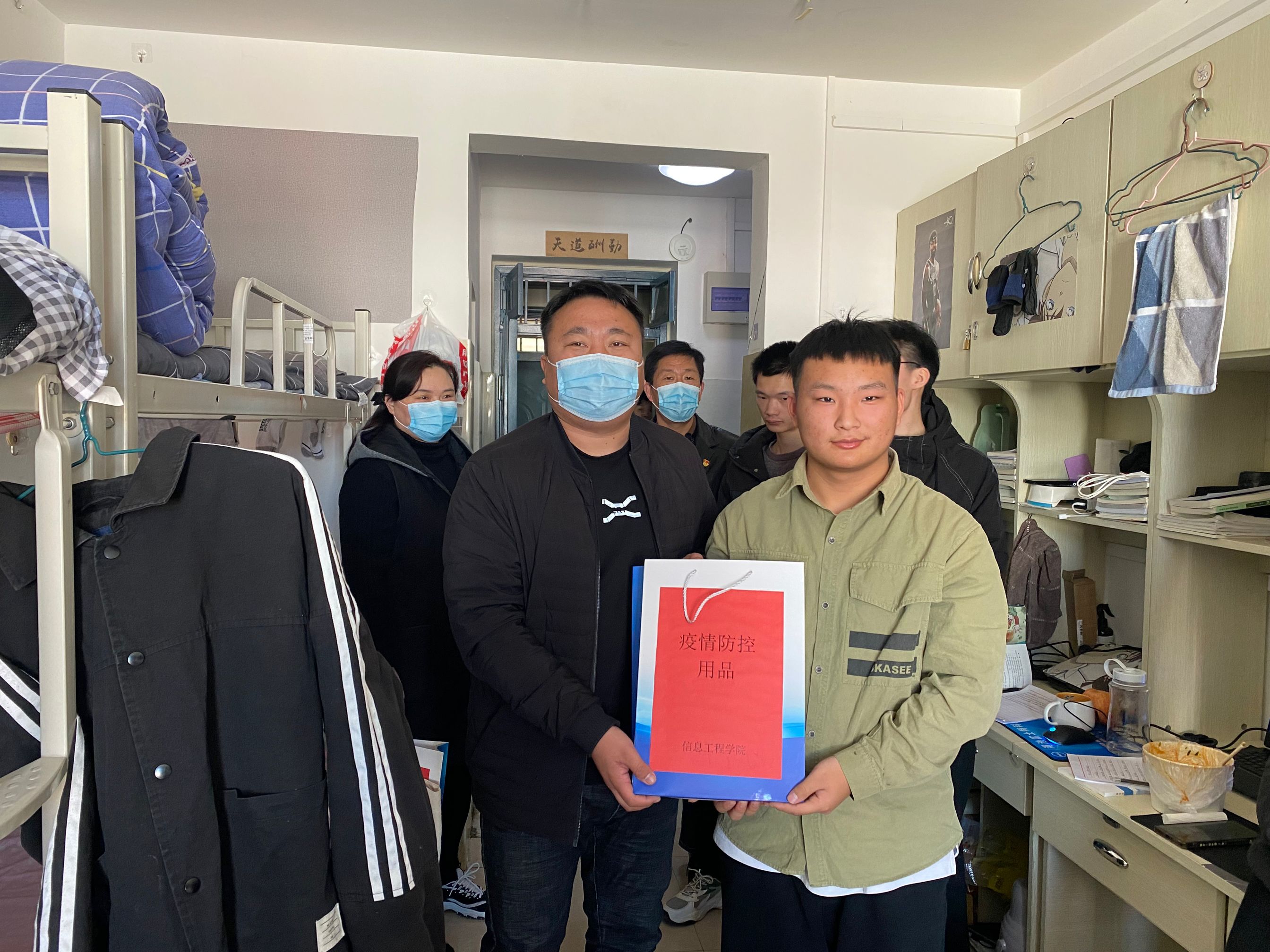 为进一步深化党史学习教育,扎实做好我为群众办实事专项工作,持续推进疫情防控常态化,切实把疫情阻断在校园之外,信息工程学院把学生身体健康放在第一位,同时守护当前来之不易的疫情防控成果。2021年11月23日,信息工程学院党总支书记楚斌、院长王雷、副院长崔琳一行深入学生宿舍为学生发送防疫物资。