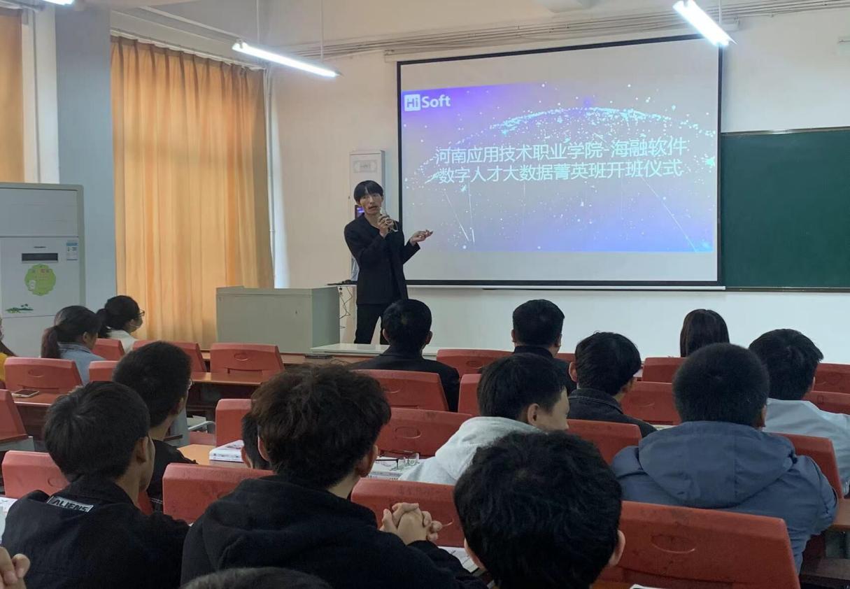 海融软件院校合作经理吴天成主题介绍“海融软件大数据人才箐英班”实施规划及“码农计划全流程项目管理方案”。吴总表示在开班过程中通过加强实践性教学、职业技能培训等措施,推进工学结合双元育人,为大数据产业培养和输送符合行业需求的应用型人才。