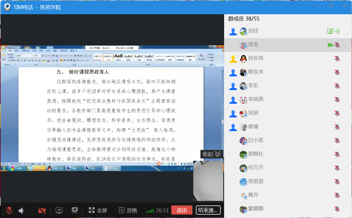2021年8月26日下午,医药学院利用网络视频召开全体专兼职教师会议,安排布置2021-2022学年第一学期开学教学准备暨网络教学工作。会议由副院长刘佳主持。