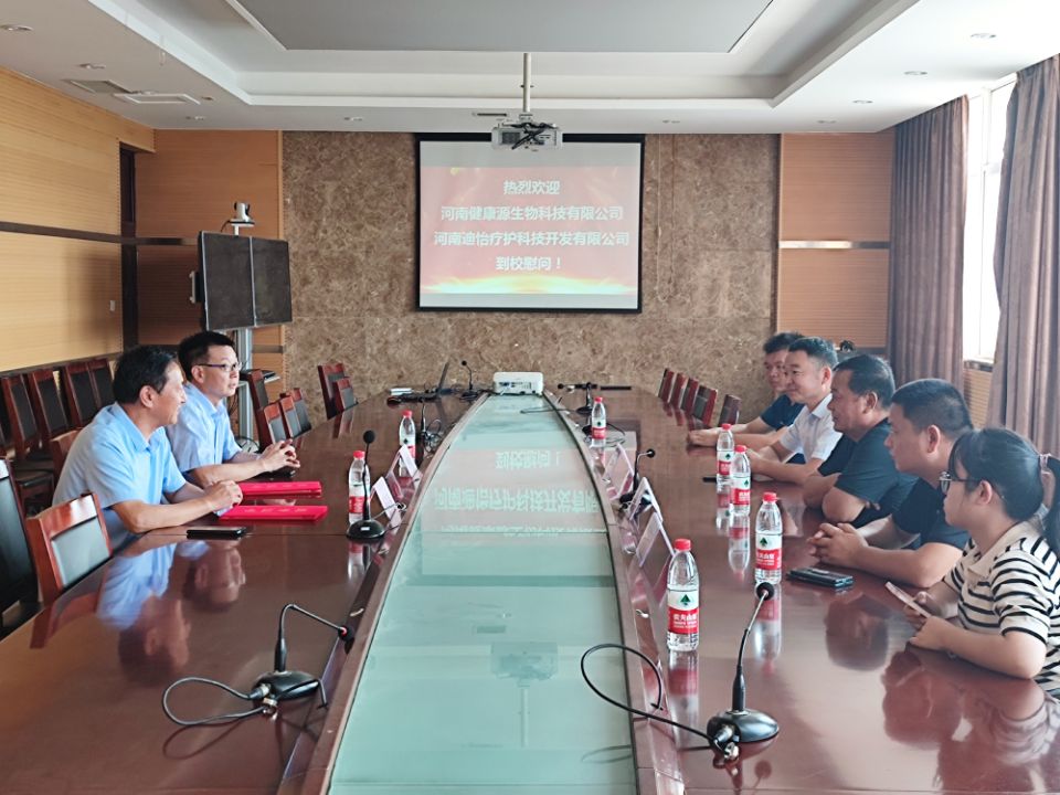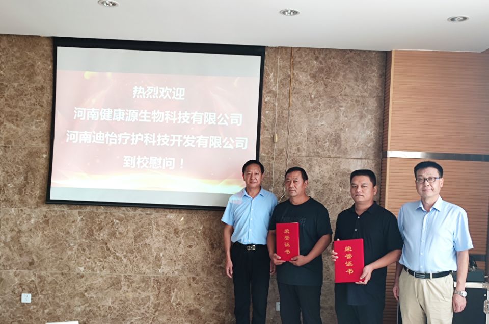 河南健康源生物科技有限公司和河南迪怡疗护科技开发有限公司是医药学院的校企合作企业,2020年在企业建立了驻企工作站,双方在人才培养、科技开发、实训基地建设等多方面达成意向,校企合作前景较好。其中侯波先生和徐耀军先生均是我校毕业生,他们是我校优秀校友代表,在工作中艰苦奋斗,团结带领企业员工取得一定成绩后,积极造福社会、回报母校,展现了我校莘莘学子的风采。