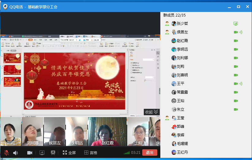 金秋时节,桂子飘香,适逢中秋佳节,又恰临国庆将至,为传承中华民族优秀传统文化,激发广大教职工的爱党爱国情怀,9月23日下午,基础教学部在线上举办了一场别开生面的“情满中秋贺佳节、共庆百年颂党恩”的诗歌朗诵活动。教学部副主任侯居左主持活动,部门全体教师参加。