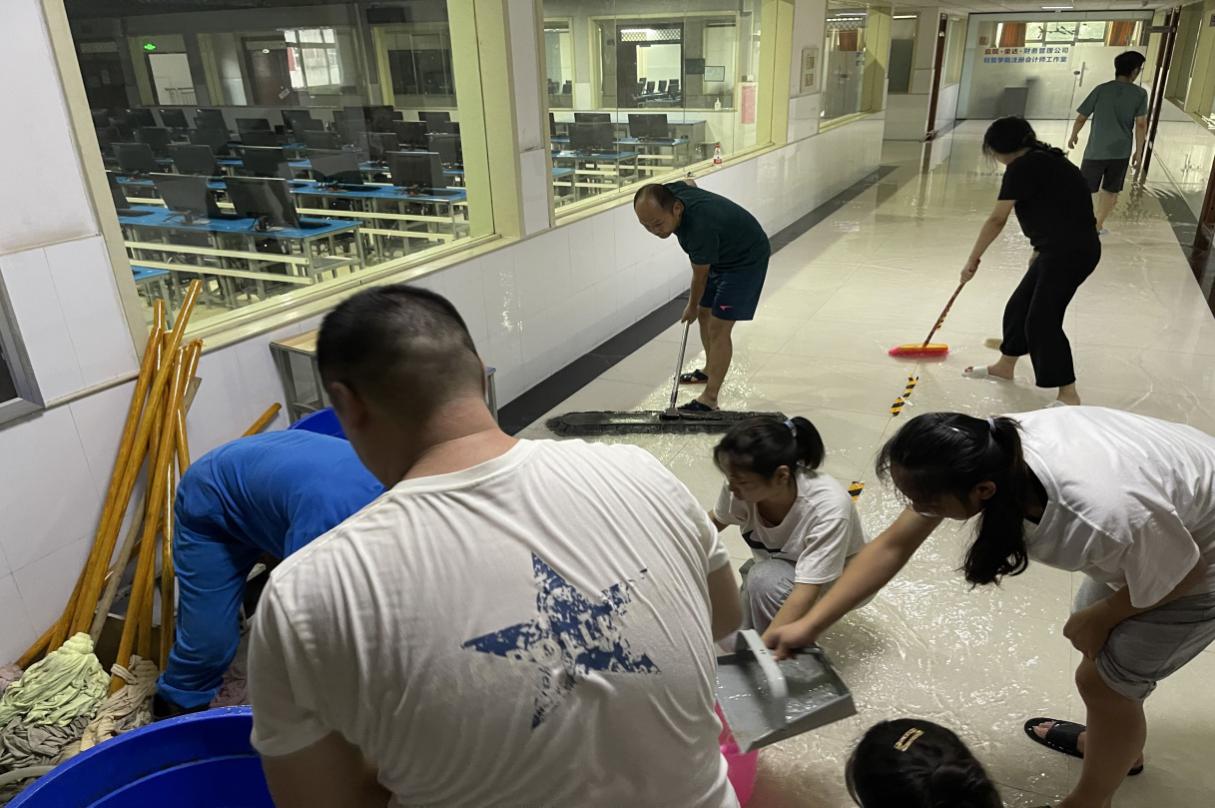 在检查中发现2号实训楼4楼东侧走廊积水、两侧实训室及教师休息室地面不同程度浸水。信息工程学院立刻启动应急机制,积极请示汇报主管领导并协同后勤处、教务处、体育教学部、经济管理学院、化学工程学院等部门协调组织积水清理工作,迅速组织信息工程学院党员及骨干教师成立专项工作小组到校进行集中排涝,同时引入排水处理公司,利用潜水泵等设备进行专业化处理。经过大家的不懈努力,7月23日上午胜利完成排涝任务。