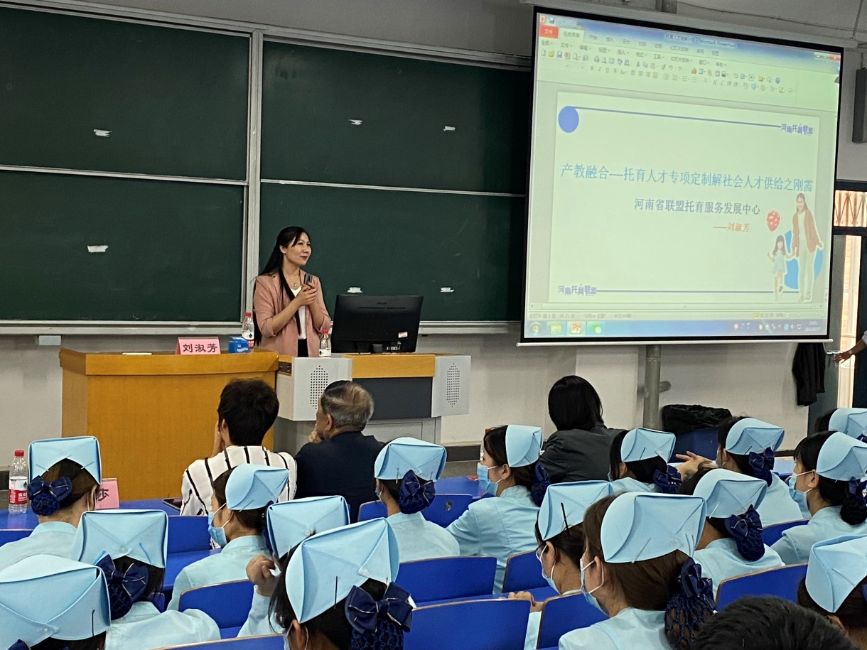 乘政策之风,我国婴幼儿照护服务行业迎来了新的发展时期,为了扩大我校学生就业渠道,响应国家托育服务专业“医、养、教”结合的政策。6月17日,河南省联盟托育服务发展中心“托育订单班”深度宣讲会暨护理学院“产教融合”实训基地挂牌仪式在我校举行。河南省联盟托育服务发展中心秘书长刘淑芳、我校护理学院院长王风云、副院长陈永惠及相关教师代表参加活动。