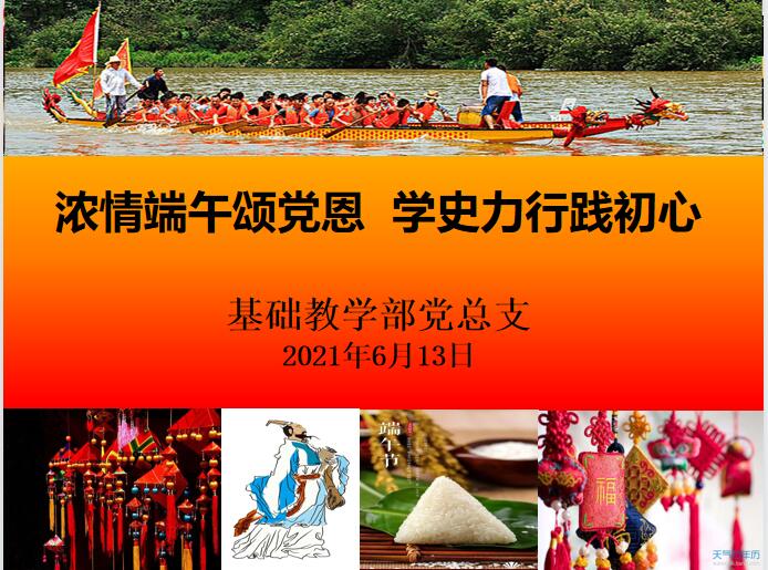 为积极培育和践行社会主义核心价值观,弘扬爱国主义精神,传承中华民族优秀传统文化,2021年6月13日下午,基础教学部党总支在办公楼110党员活动室开展了一场别开生面的“浓情端午颂党恩,学史力行践初心”的迎端午党史学习教育主题活动。