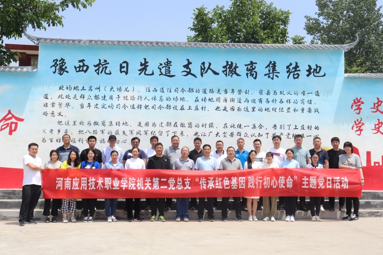 河南(豫西)抗日根据地是全国19块抗日根据地之一。巩义市涉村镇是革命老区旧址所在地。抗日战争爆发后,日本侵略者对中原地区发动了疯狂进攻,国民党政府推行不抵抗政策。作为河南地区抗日主要力量的八路军豫西抗日先遣支队在支队司令员皮定均、政委徐子荣带领下挺进中原,阻敌西进,留下了英勇杀敌、驱逐日寇的光辉事迹。2021年5月21日,学校机关第二党总支书记黄体锐带领30名党员赴巩义市涉村镇豫西抗日先遣支队司令部旧址、巩县抗日民主政府旧址等红色教育基地开展主题党日活动。全体党员在红色革命旧址现场体会党的光辉历史,领会革命先烈的伟大精神,厚重的革命精神、丰富的资源、鲜活的教科书,构成了全方位、立体化党史行走课堂。