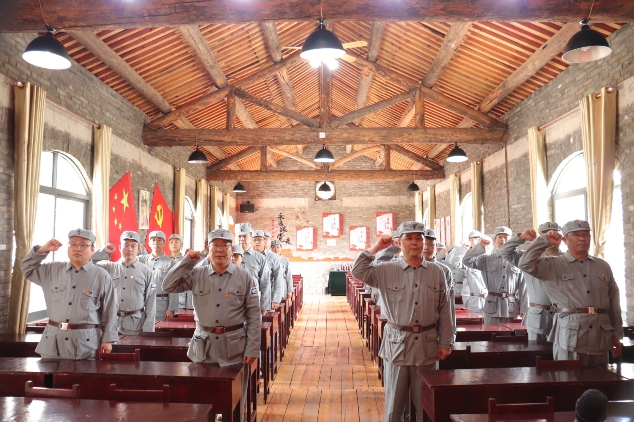 “红船”前头重温入党誓词,红船精神渗入血脉。习近平总书记强调:“上海党的一大会址、嘉兴南湖红船是我们党梦想起航的地方。我们党从这里诞生,从这里出征,从这里走向全国执政。这里是我们党的根脉”。位于涉村镇的北庄村的红船记忆党性教育基地是巩义市最新打造的集党员党性教育、乡村振兴、美丽乡村建设于一体红色教育名片。红船记忆教育基地内建造了一艘原比例复制的嘉兴“红船”。机关第二党总支全体党员身着八路军装,整齐排列参观“红船”,集体观看习近平总书记在嘉兴红船纪念馆的重要讲话精神视频资料,现场体会党的一大成立时的历史性场景。党员们身历其境,对于以“开天辟地、敢为人先的首创精神、坚定理想、百折不挠的奋斗精神、立党为公、忠诚为民的奉献精神”为精神主核的红船精神有了更真切的体会。党性教育基地会议室,面对鲜红的党旗,全体党员重温入党誓词,铿锵有力的宣誓声久久回荡在湛蓝的天空中。