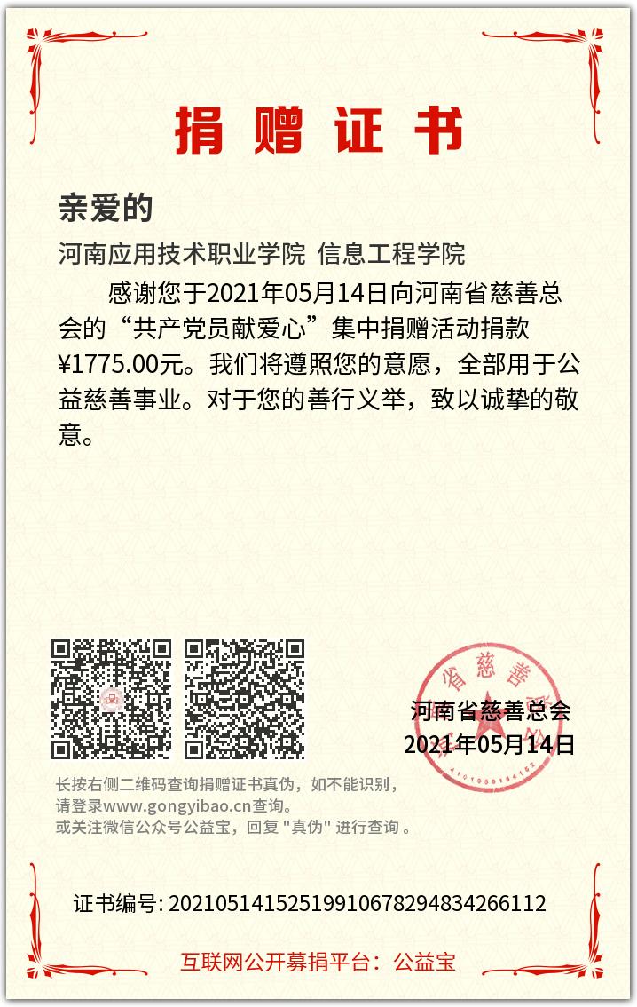为其三天的义卖活动,共有18位教职工和52名学生购买心爱作品,义卖资金总计1775元,全部以信息工程学院党总支的名义一次性捐助到河南慈善总会“共产党员献爱心”活动,用于“助力脱贫攻坚·点亮学子希望”慈善助学项目。
