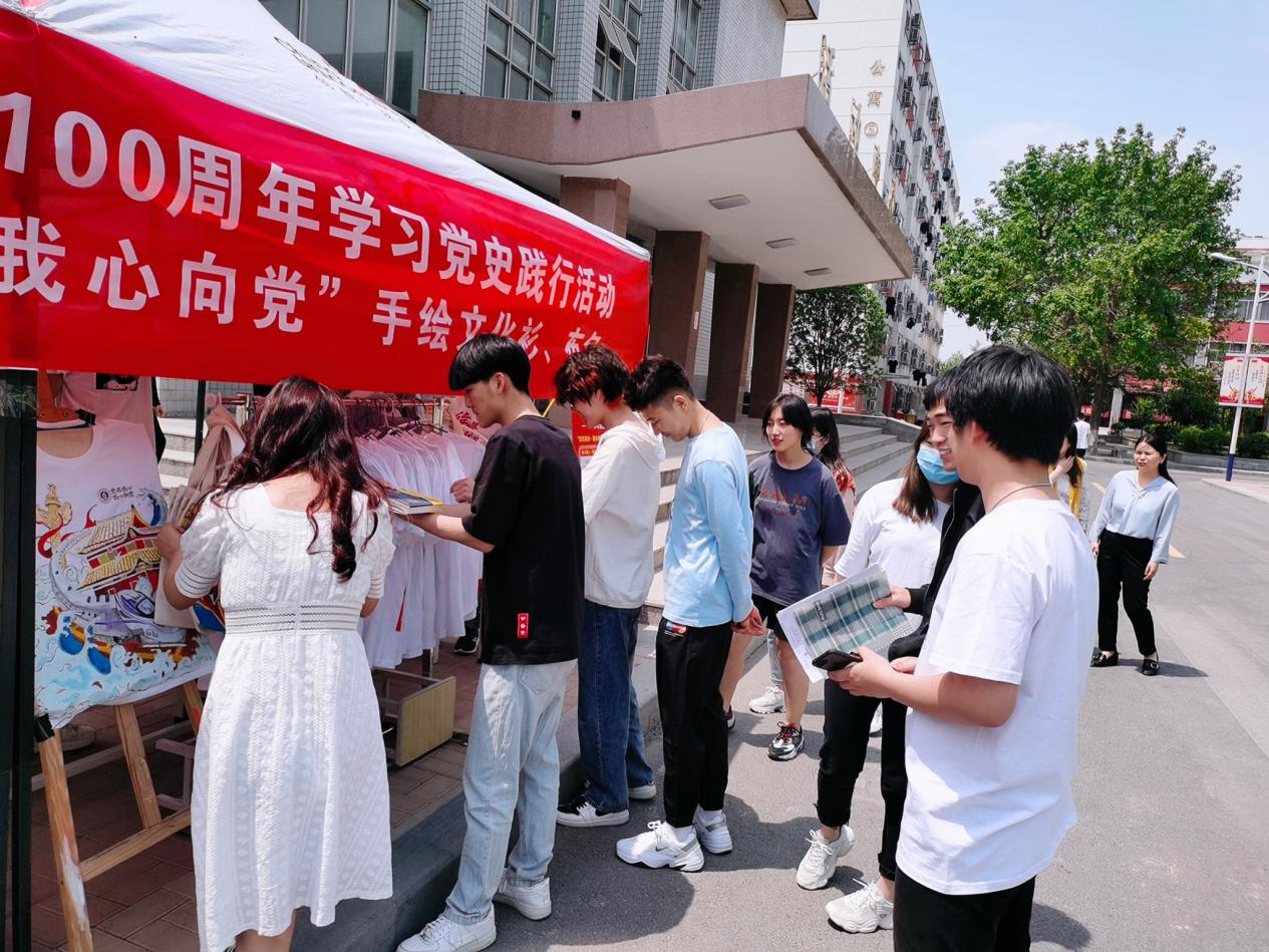 义卖当天,信息工程学院把动漫制作技术和视觉传达设计专业的部分师生精心手工绘制有党史学习主题图案的50件文化衫和40个布包全部展出义卖,引起了全校师生的强烈共鸣,他们被这些作品的精美的画工和巧夺天工的构思所吸引,纷纷前来围观、购买,奉献自己的一片爱心。为了满足个性化需求,学院组织相关专业师生现场助阵,拿起手中的画笔进行现场定制。