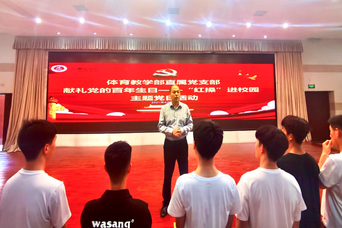 为推动党史学习教育走向深入,2021年5月18日下午,体育教学部直属党支部开展了“红操”进校园主题党日活动,以学党史、跳“红操”的形式向党的百年生日献礼。此次活动由体育教学部直属党支部书记李向民主持,体育教学部全体党员和二级院部学生代表参加。