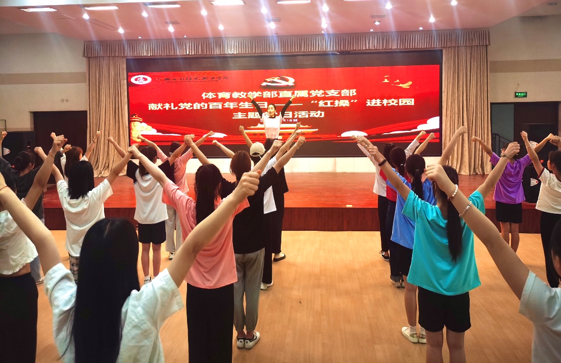 随后,体育教学部全体党员和学生代表齐跳“红操”,用肢体语言表达对党的敬意和祝福,以及热爱党、热爱祖国的心声。