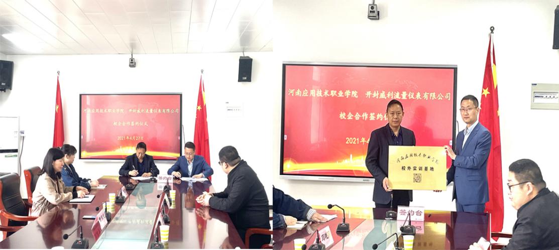 签约仪式上,院长黄双成与开封威利流量仪表有限公司总经理董炜就校企产学研合作事宜进行了洽谈磋商。双方均对本次产学研合作充满憧憬,并表示在接下来的合作中会进一步取长补短,发挥优势,开拓创新,强强联合,实现共赢。之后,双方现场签约并互相授牌。