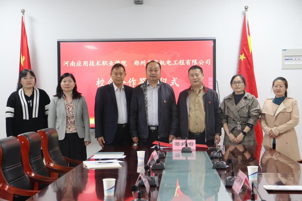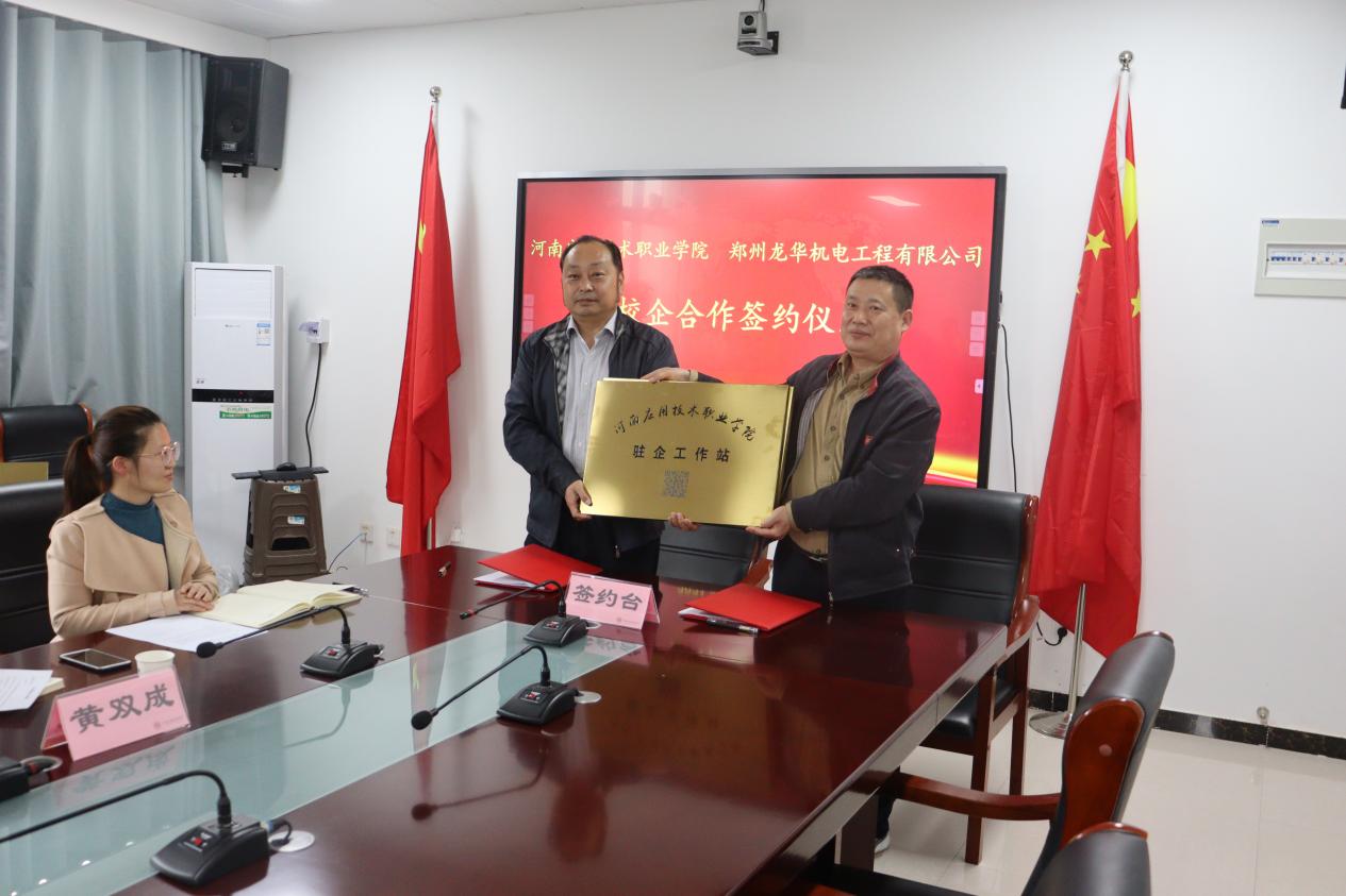 签约仪式上,黄双成首先介绍了与郑州龙华机电工程有限公司在人才培养、工学交替、职业培训、基地建设等方面的合作办法;之后,副校长薄新党与郑州龙华机电工程有限公司副总经理王向阳现场签署校企合作协议,并互相授牌。