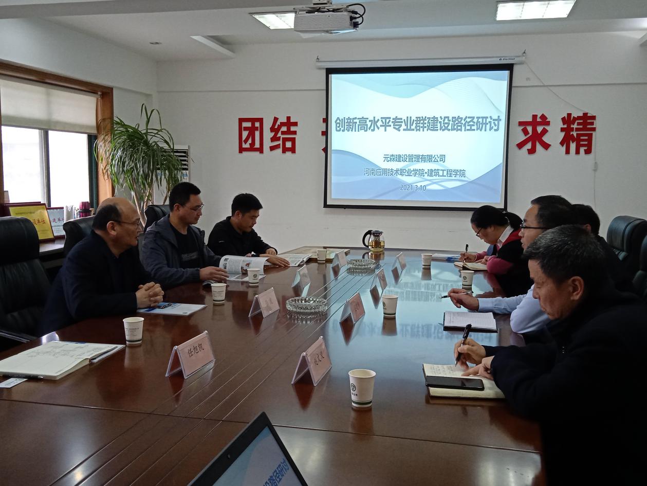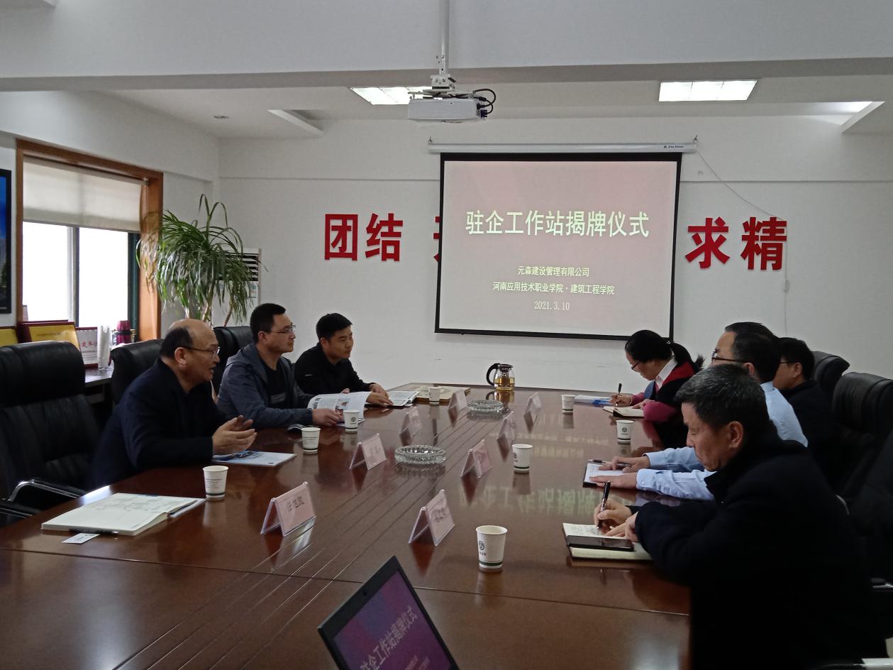 为进一步深化校企合作,加强双师教师培养、推进专业群建设及“三教”改革,培养合格专业技能人才。3月10日上午,建筑工程学院院长张虎等一行4人来到河南元森建设管理有限公司,出席驻企工作站签约及挂牌仪式,并参加深化校企合作产教融合研讨会。河南元森建设管理有限公司董事长李威、副总经理范建伟、赵文义等企业领导出席。