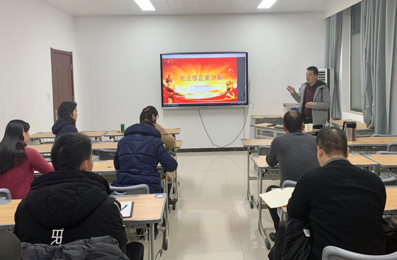 2020年12月4日是我国第七个国家宪法日,为进一步增强宪法意识,深入贯彻落实党的十九届五中全会精神,学习宣传习近平法治思想,基础教学部党总支于2020年12月17日组织开展了“深入学习宣传习近平法治思想,大力弘扬宪法精神”主题党日活动。本次活动由党总支副书记张振华主持,基础教学部党总支全体党员参加。