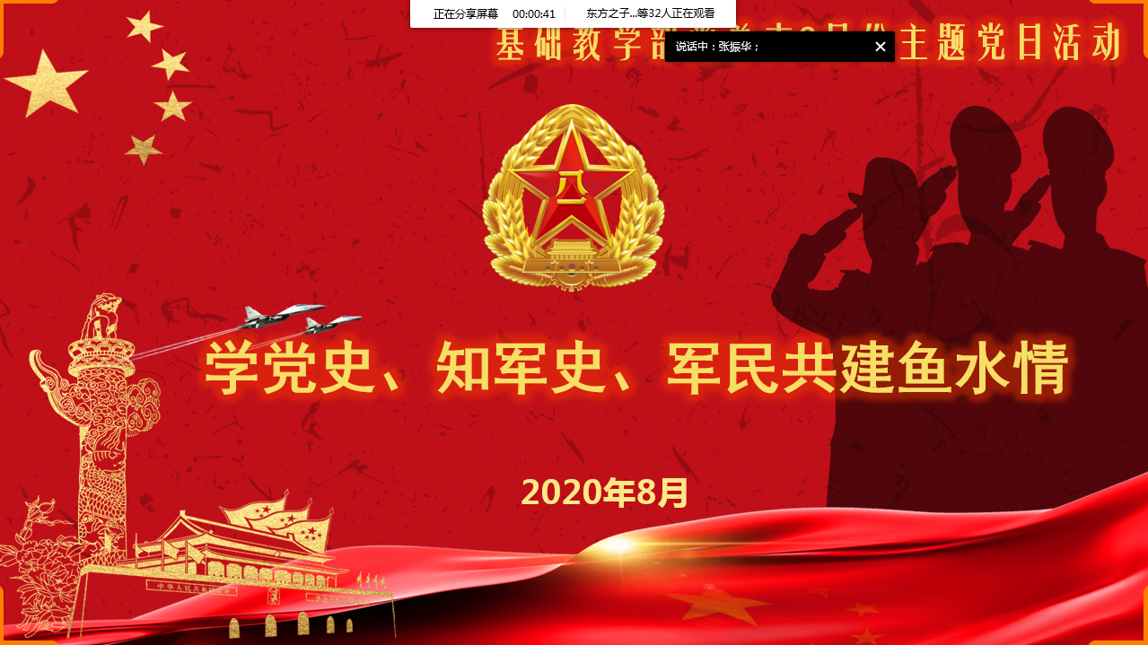 为庆祝“八一建军节”,培养党员吃苦耐劳、勇于奉献的精神,进一步增强党员的政治意识、大局意识、核心意识和看齐意识,2020年8月11日下午,基础教学部党总支组织开展了“学党史、知军史、军民共建鱼水情”线上主题党日活动。本次活动由党总支副书记张振华主持,基础教学部党总支全体党员和入党积极分子参加。