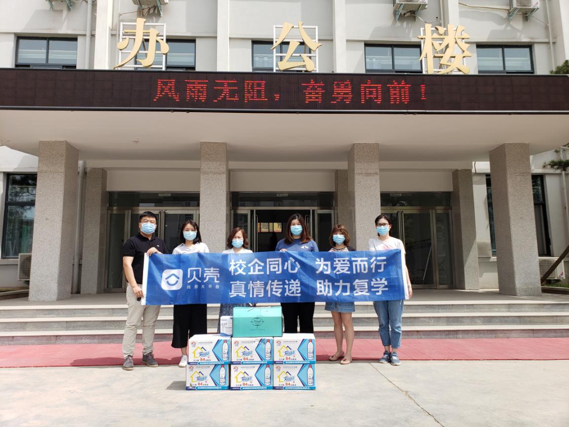 5月27日上午,河南贝壳信息技术有限公司校招部主管李梦梦、陈家乐代表企业向我校商学院捐赠了消毒液、洗手液、体温计等疫情防控物资,携手助力学生返校复学后疫情防控工作。