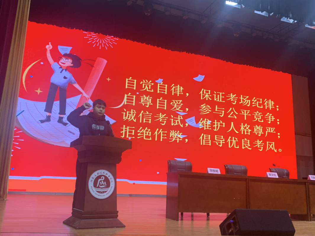 最后,本科部党总支书记滕文锐再次强调了严肃考风考纪的重要性,她讲到“人而无信,不知其可”,并向同学们提出三点要求:一是全体同学认真复习,积极备考,严守考试纪律,诚信考试,自觉抵制考试中的各种不良风气,认真学习《学生手册》,千万别触碰红线;二是学生党员、干部要带头遵守考场纪律,以身作则,从我做起,为全体同学做出表率;三是同学之间互相提醒相互督促,防范作弊,弘扬正气。她希望同学们凭自己辛勤的汗水和真才实学,在考场上发挥出色水平,以诚信考试为荣,以违纪作弊为耻,弘扬求实学风,维护知识的尊严,用诚信品德向自己、老师和家人交上一份高水平的答卷!
