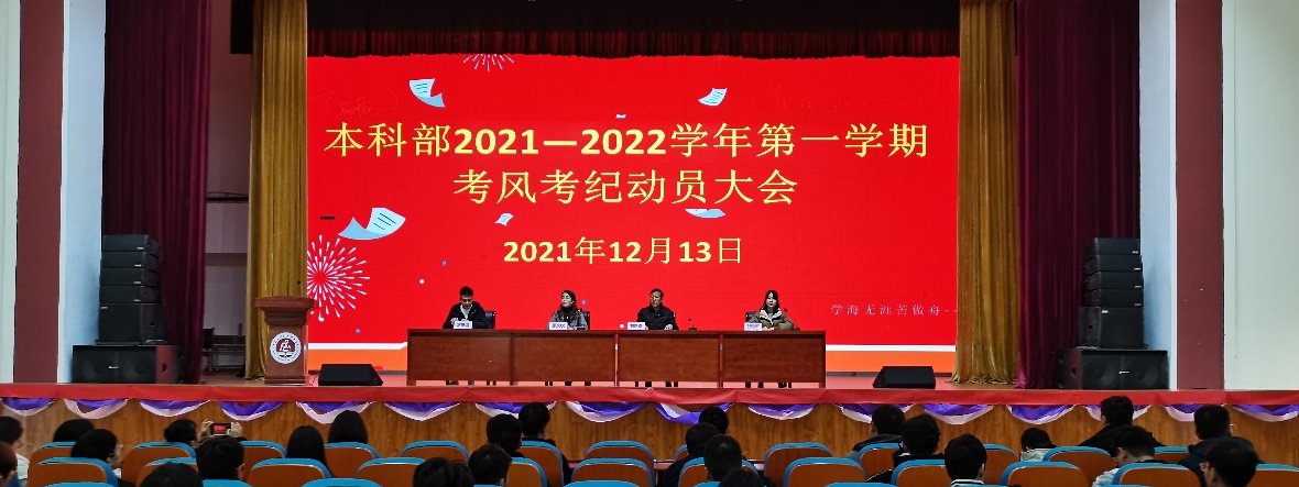 为进一步严肃考风考纪,加强学风建设,营造严谨求实的学习氛围,诚信作答的考试环境,12月13日,本科部在学生活动中心召开2021-2022学年第一学期考风考纪动员大会,本科部全体师生参加此次会议。大会由本科部主任刘新奇主持。