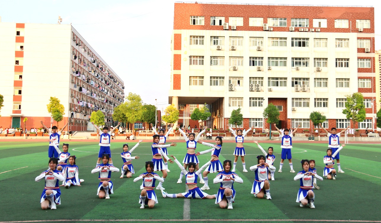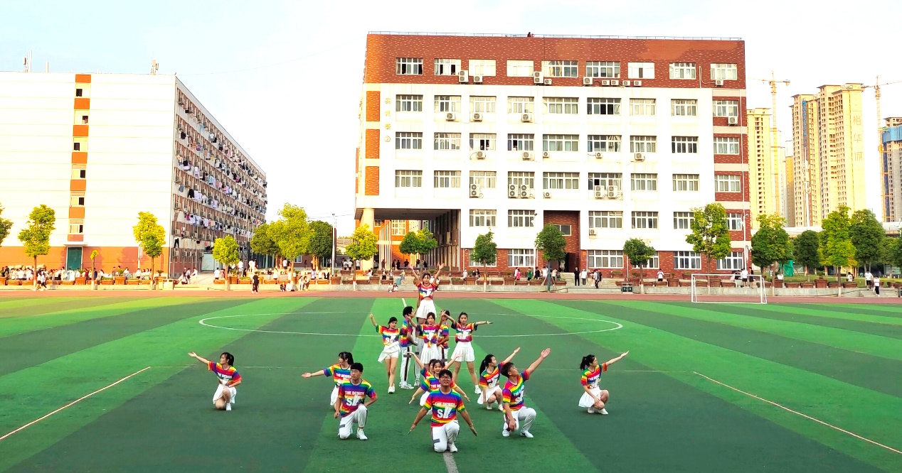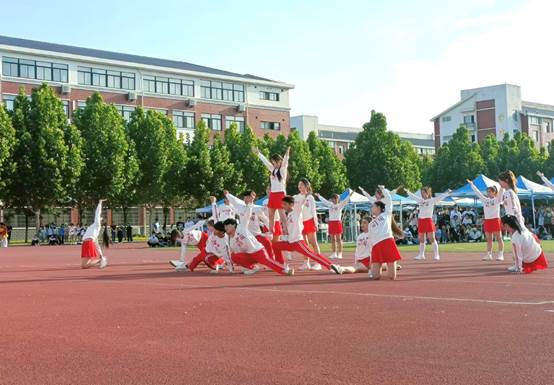 赛场上同学们身着炫丽的比赛服装,手持色彩斑斓的花球,伴随着动感激昂的音乐踢腿、旋转、跳跃,用活泼热情的舞姿、多种多样的造型,以及饱满的精神和灿烂的笑容展示着我校学子活力四射、昂扬向上的精神风貌,形成了校园一道靓丽的青春风景线。