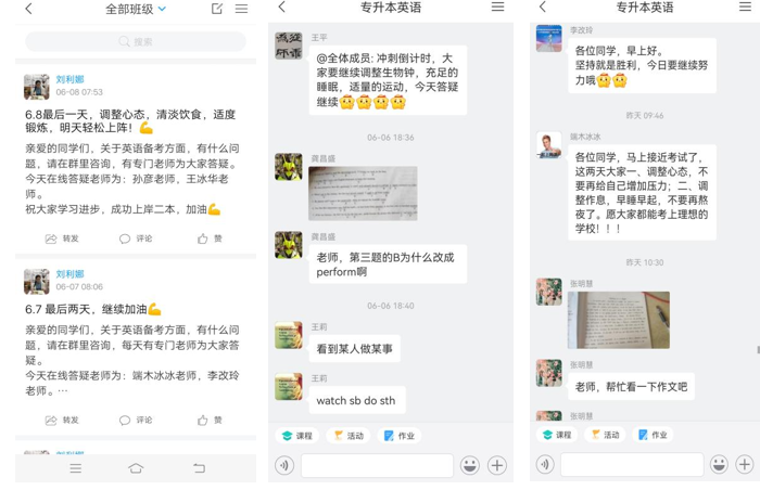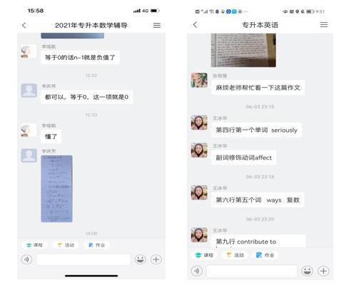 5月24日当日两个辅导团队即开始在学习通平台为进群的学生进行每天24小时不间断的在线答疑解惑。老师们为考生们奉献了他们精心录制的教学视频、题库等资源;同时《专升本英语》、《专升本数学》两门在线精品课程无偿为大家开放,供学生们进行复习巩固。