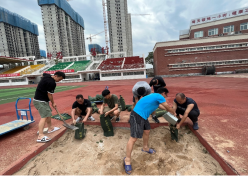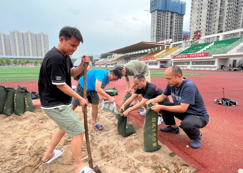 体育教学部首先对运动场地、场馆,体育器材室及电力设备等进行了安全风险隐患排查,针对排查中发现的问题第一时间采取措施,消除隐患。随后大家手拿铁锹进行防汛沙袋填装,并将沙袋搬运到各场馆门口处筑起防汛堡垒。除此之外,体育教学部还成立了防汛应急小分队,随时待命,确保险情出现时应急队伍拉的出、打得响。