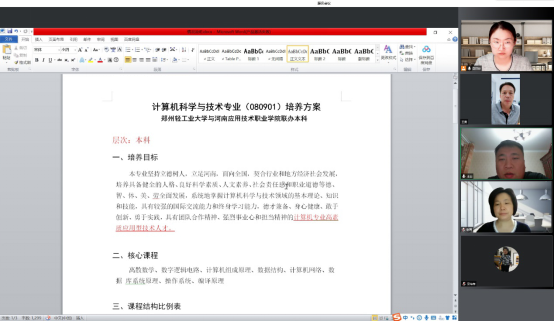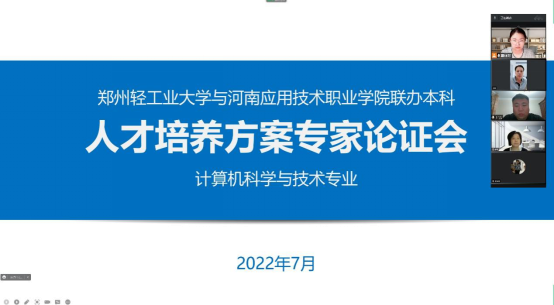 为顺利完成我校与郑州轻工业大学联办本科专业人才培养方案制定工作,紧扣学校建设应用型高等职业本科层次教育的发展定位,进一步深化教育教学改革,创新人才培养模式,提高本科人才培养质量。7月12日,在教务处的指导下,以信息工程学院为主导,计算机科学与技术专业人才培养方案专家线上论证会顺利召开。论证会邀请到郑州轻工业大学计算机与通讯工程学院院长张秋闻教授、华北水利水电大学建筑学院党委副书记朱齐亮教授、河南省水利厅高级工程师任建勋、黄河水利委员会信息中心主任高级工程师冯建、蓝鸥科技有限公司高级软件设计师总裁崔亚允、达内科技有限公司高级人力资源管理师总经理李勇等六位高校和行业专家。我校信息工程学院院长王雷、专业负责人夏丽珍及部分骨干教师参加了会议。