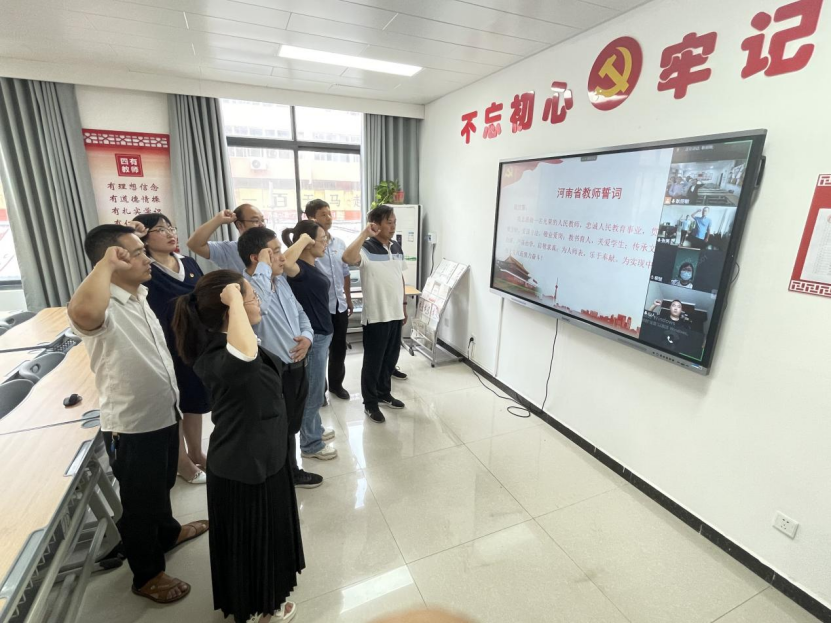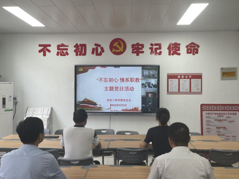 9月9日,机电工程学院党总支在行政楼A212党员活动室举行“不忘初心 情系职教”主题党日活动。活动由党总支组织委员东伟主持,党总支全体党员以线上+线下的方式参加本次活动。