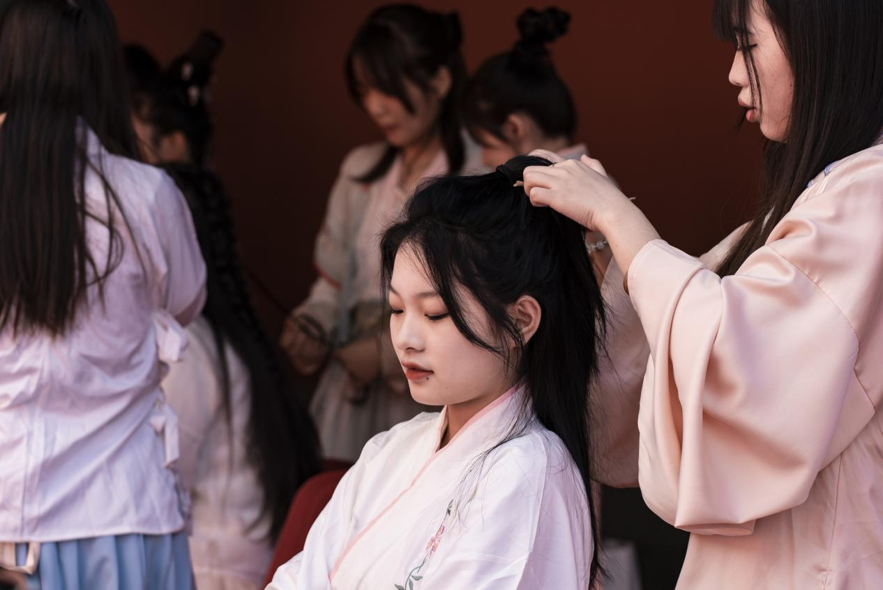为映衬活动主题同学们也纷纷穿上汉服相互给对方做妆造“服章之美”中体验传统文化独特魅力